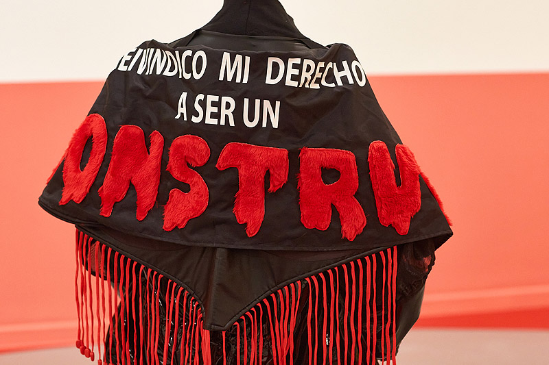 Dos figuras nos reciben en este espacio vistiendo los mismos vestidos que CAp y Lobe lucen durante la performance. Los atuendos son obra de Feli Quispe con una cita homenaje a Susy Shock. Son furries, personajes conocidos en la cultura pop caracterizados por imaginar una trans-especie de aspecto animalesco, pero con capacidades humanas.