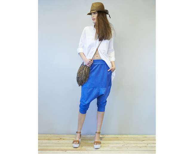 La colección Primavera- Verano de Eduardo Rivera es para un hombre urbano y cosmopolita con telas elásticas y algodones orgánicos en bombers, pantalones baggy, camisetas, shorts y trajes completos, prendas fáciles de combinar en tonos azules, rosas y colores tierra. Los complementos que destacan son maxibolsos, sandalias, zapatillas, foulards de colores y gafas de sol. La moda de baño con sus estampados florales son una explosión de color perfecta para lucir en la playa.