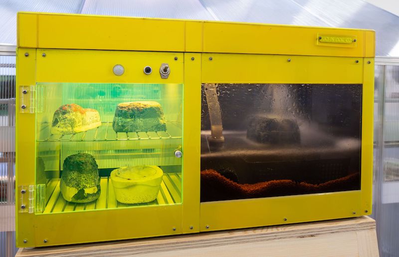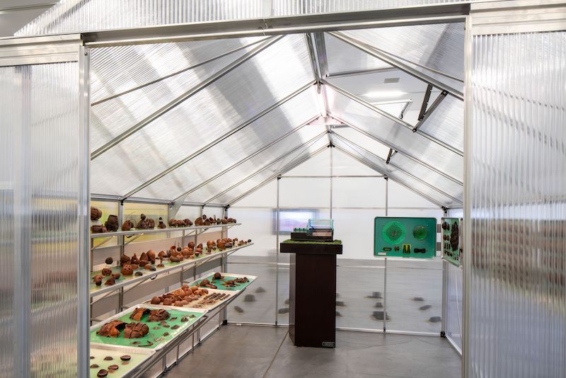 Y Carl Cheng con su Laboratorio Orgánico en forma de invernadero, presenta las erosiones y los cambios medioambientales incluyendo sus máquinas de erosión de alimentos.