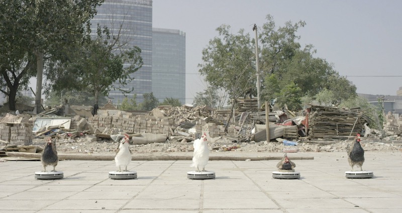 La siempre asombrosa Cao Fei con su pieza Rumba II. Nomad idea un modo de transporte individual para las gallinas nómadas desplazándose subidas en un robot de limpieza rumba. Y es que tras la demolición de un barrio en las afueras de Pekín, los pocos residentes que quedaron parecian perdidos en medio del vasto paisaje en ruinas. Las políticas de urbanización de China obligan a millones de personas a abandonar sus hogares y sus tierras de cultivo para dar cabida a modernos rascacielos y parques empresariales. Por los campesinos y sus gallinas también se convierten en nómadas.