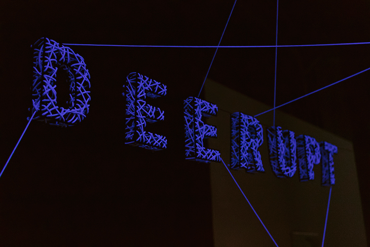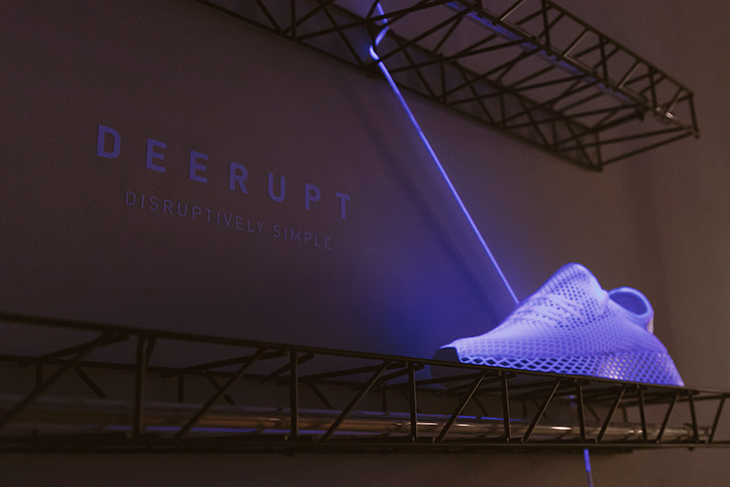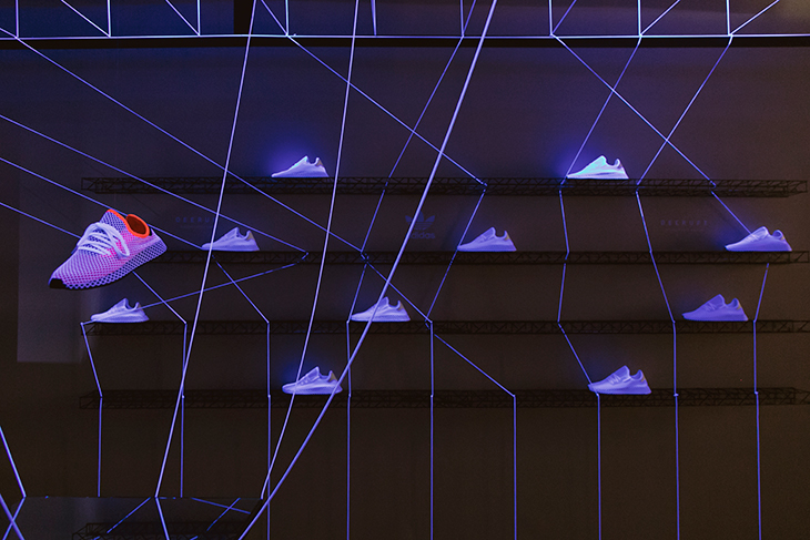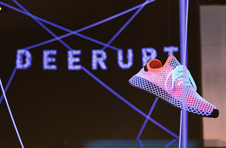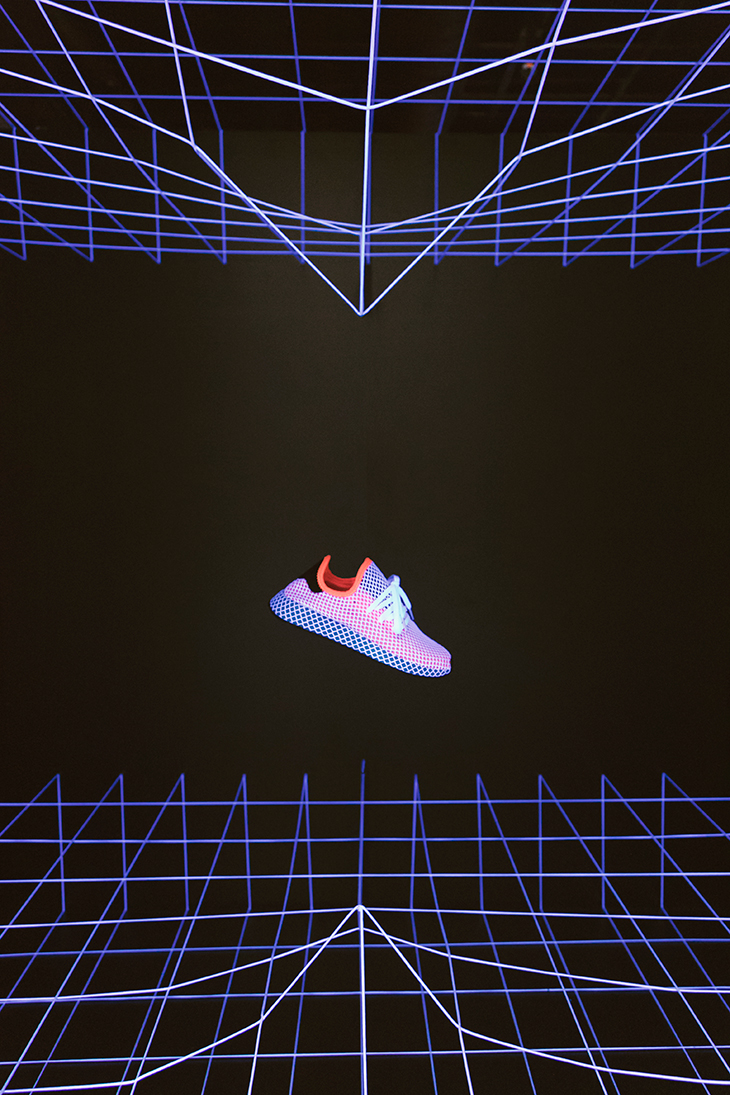 Impregnada por toda la parafernalia que rodea al mundo 3D, tan de moda, las zapatillas de la redecilla, registradas baja el nombre de Deerupt, se presentaron lúdicamente en la tienda Sivasdescalzo de Barcelona. Por una noche, este escenario comercial se convirtió en algo parecido al interior de un programa 3D, el autoCAD o algo así, todo lleno de retículas poliédricas luminosas.