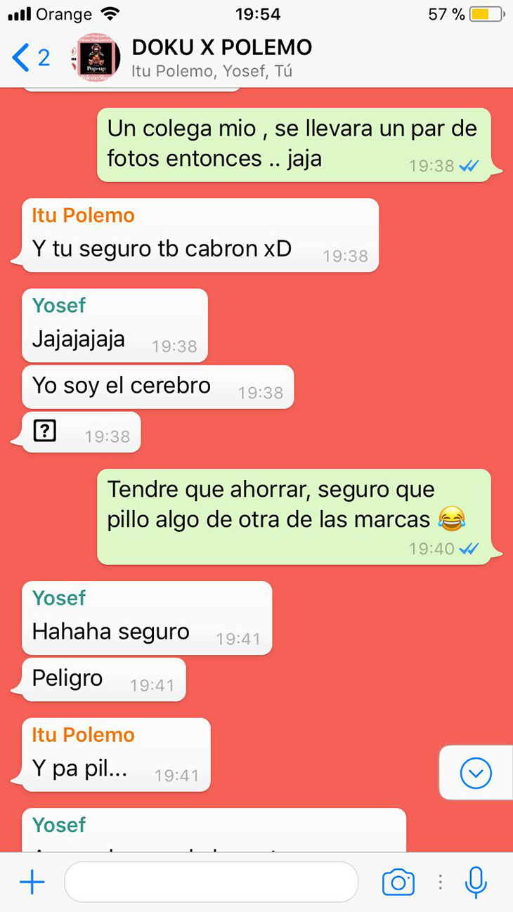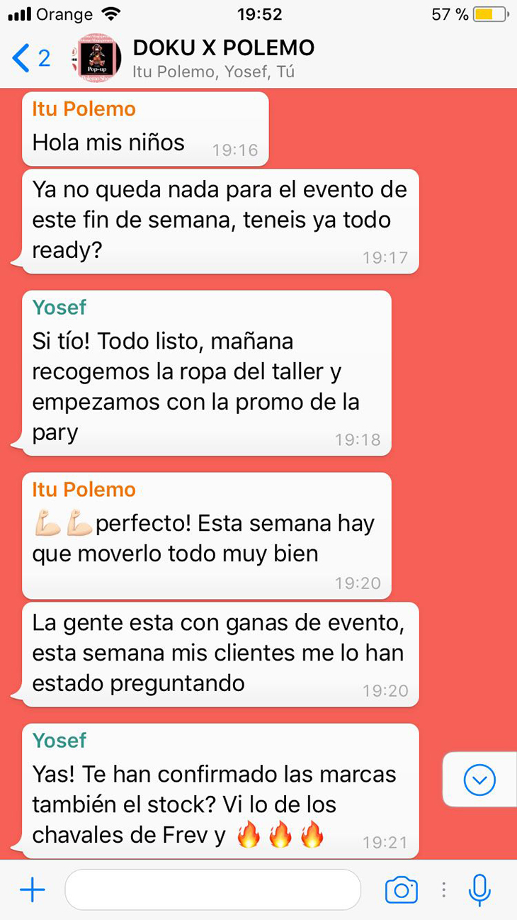 [18/3/18 19:18:58] Yosef: Si tío! Todo listo, mañana recogemos la ropa del taller y empezamos con la promo de la pary