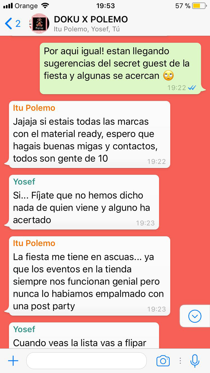 [18/3/18 19:23:11] Itu Polemo: La fiesta me tiene en ascuas… ya que los eventos en la tienda siempre nos funcionan genial pero nunca lo habiamos empalmado con una post party