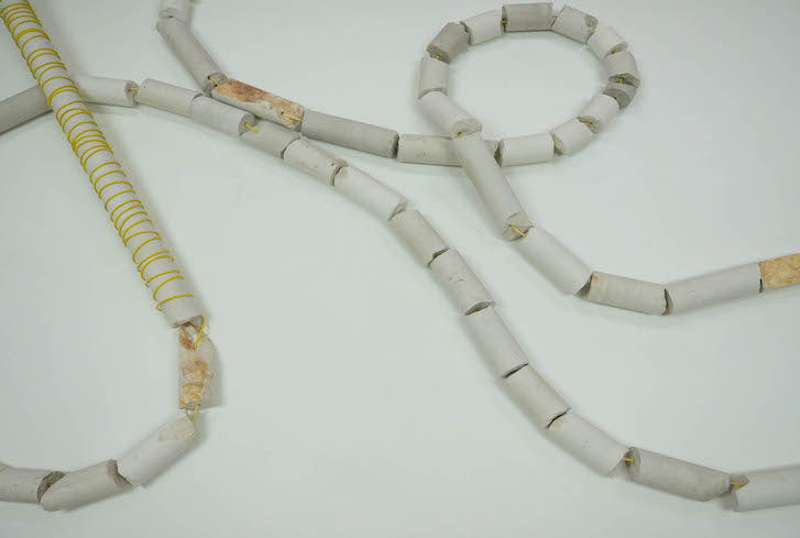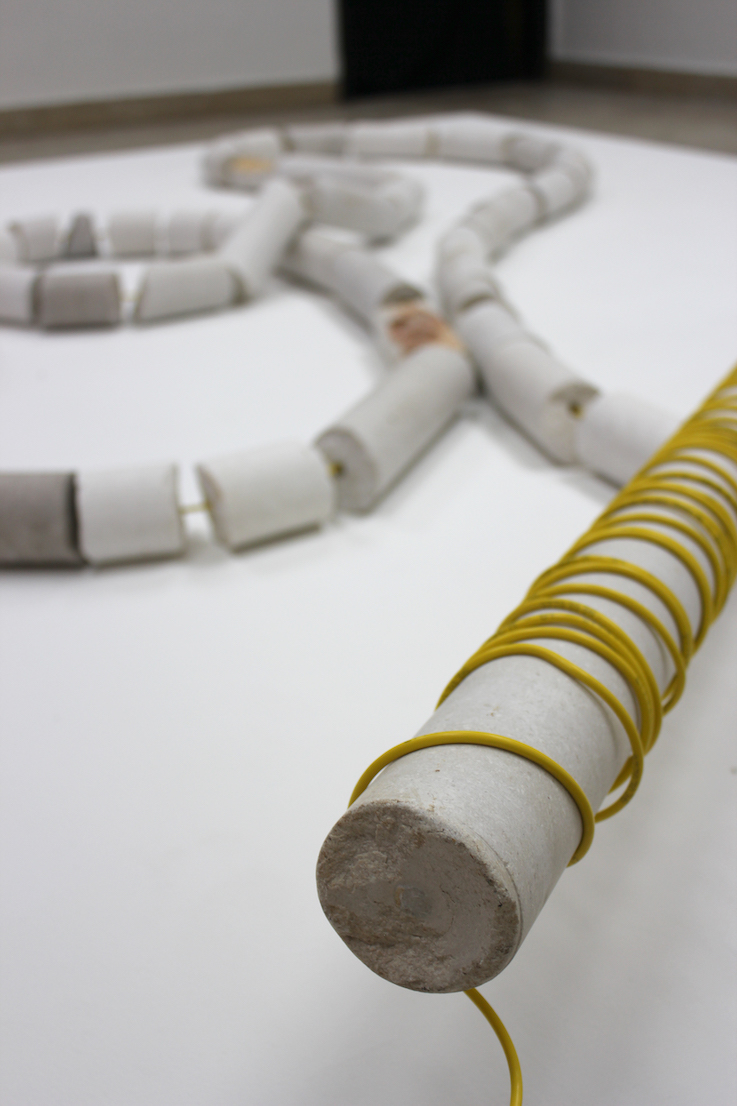 Miguel Soto, Veranito de San Juan, 2019, muestras de núcleo de piedra blanca, cables de calefacción eléctrica. Vista instalación.