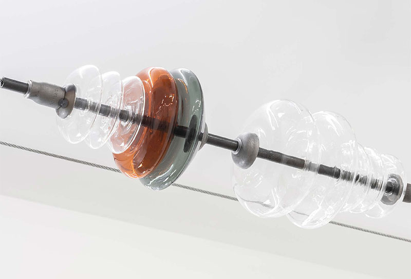 En esta exposición aparece el vidrio como aislante eléctrico, elemento que a día de hoy se sigue utilizando en las torres de alta tensión para proteger los sistemas. Me interesa la noción material que tenemos de este elemento, que pensamos como frágil, y cómo es usado por su capacidad de contener y preservar esa fuerza eléctrica de alto voltaje.