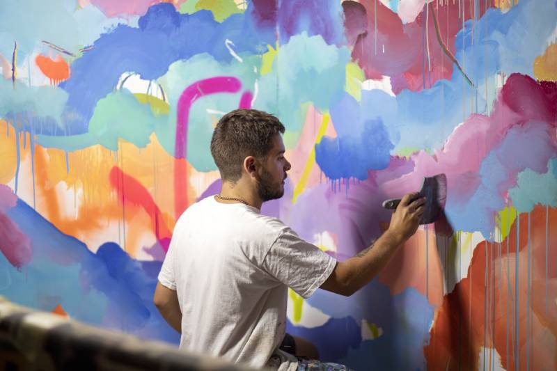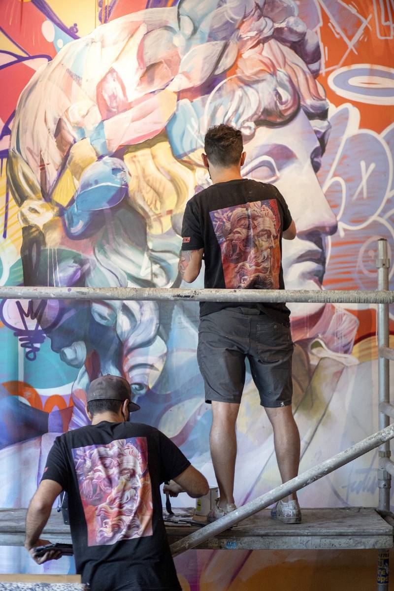 PichiAvo (@pichiavo) pintando su mural en el Flax and Kale de El Raval de Barcelona