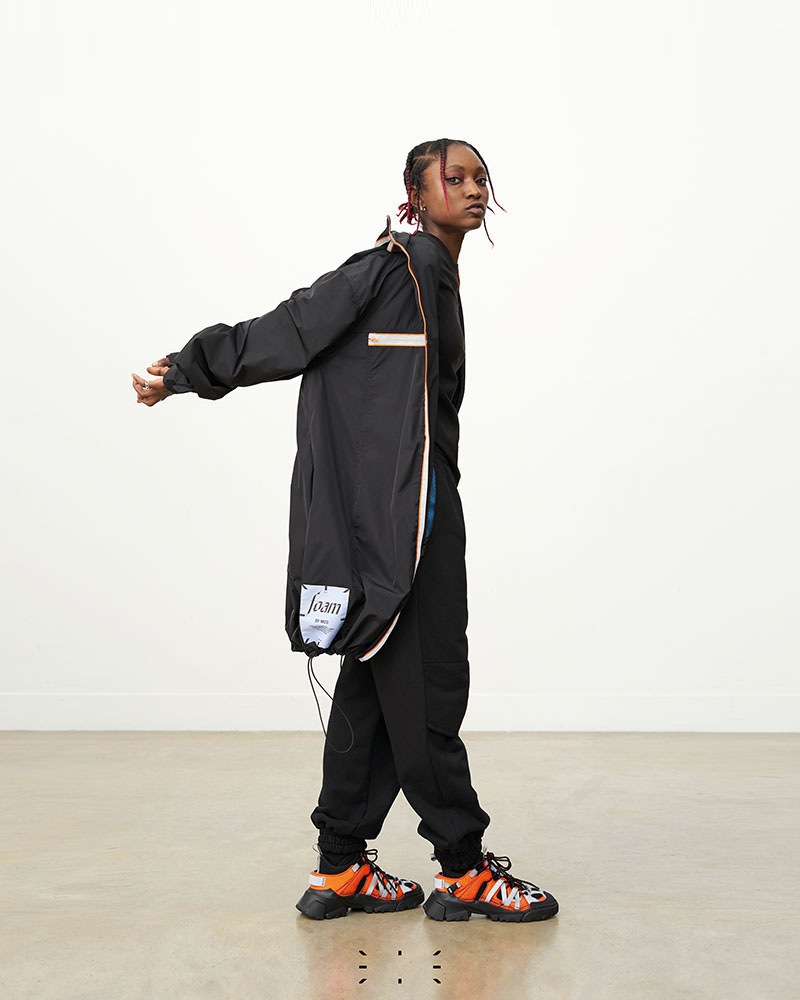 Aparte de las prendas de la nueva colección de Foam by MCQ en las que se incluyen elementos como la fibra de desecho textil reciclada, la cinta framis industrial como fijación en las prendas de denim o la fibra de cachemira reciclada de las prendas de abrigo de poliuretano transparente, nos encontramos con un nuevo modelo de zapatillas y una mochila con tela acolchada que sigue la misma estela de este nuevo “Icono” de MCQ.