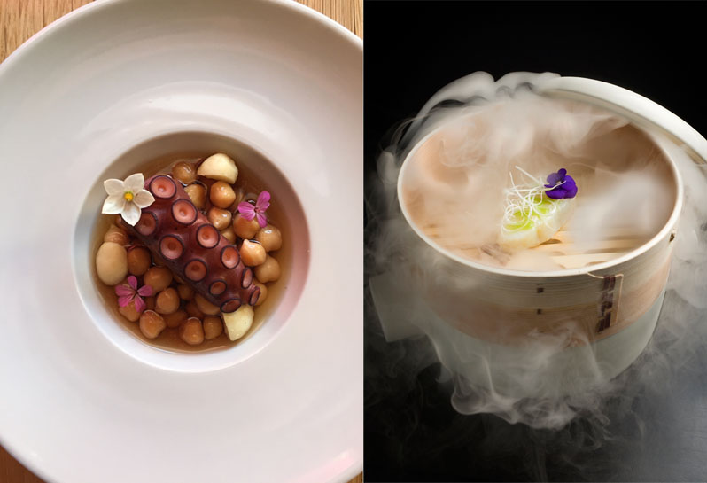 Imagen superior izquierda: plato de Joaquín Boyero de Boca Acción. Imagen derecha: Lenguado yuzu y puerro del restaurante 47 Ronin.