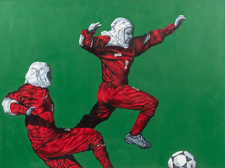 La muestra “Football is Art” bucea por todos sentimientos que genera el fútbol. El artista británico Derek Boshier, estrecho colaborador de David Bowie, retrata la intensa expectación que se vive en casa viendo un partido, con su obra Penalty, mientras que Jill Iliffe capta el orgullo y determinación de las jugadoras musulmanas de Jordania en su obra, Banned.