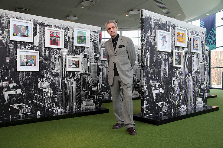 El artista y comisario cultural Kosmo Vinyl, ex manager de The Clash y fan incondicional del West Ham United, delante de sus collages Is Saitch Yer Daddy? ©Jason Lock