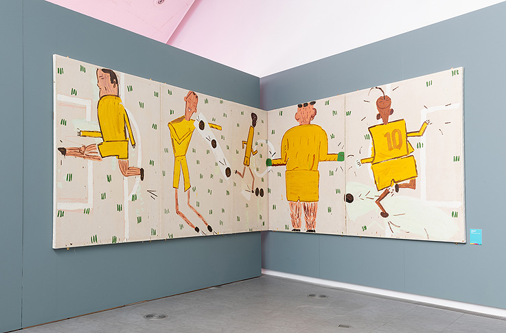 Varios artistas ponen en foco el carácter de las grandes estrellas del juego: Eric Cantona aparece como un diablo rojo en Le Rouge Devil, de David Hughes: una referencia a la personalidad controvertida del francés – y al apodo de su ex club, Manchester United. En un formato mucho más grande, Rose Wylie examina las rasgos deportivos de “estos dioses del fútbol que siempre salían en los periódicos” como Crouch, Ronaldhino, Rooney o Henri en su obra Yellow Strip, realizado en óleo y tiza sobre tela.