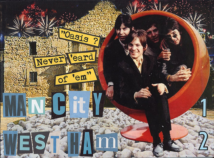 Saitch 195, Kosmo Vinyl: esta obra celebra una victoria del West Ham sobre Manchester City, con una broma incluida a costa de la banda Oasis, mancunianos e incondicionales del Man City ©Kosmo Vinyl