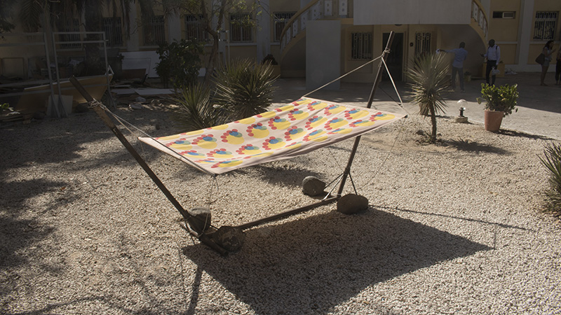 La segunda contribución que realicé para el proyecto de la bienal eran una serie de pinturas acrílicas, que eran hamacas, que eran partituras. Durante la inauguración, las partituras se tocaron sin ser anunciadas y el sonido de las performance se incorporó al sonido general de la inauguración de una forma muy sutil. La composición buscaba relacionarse con la enorme presencia de patrones textiles en Dakar, y pensar en cómo traducir esos elementos textiles a formas musicales; además de generar un espacio confortable desde donde practicar la escucha atenta.