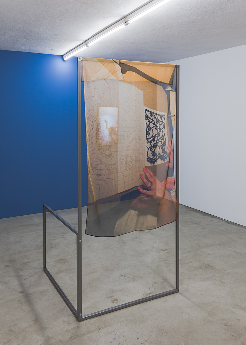 Lorenzo Sandoval. ‘Soft Capital’, 2018 Impresión digital en chiffon 40 gr y estructura de hierro. Shadow Writing (Lace /Variations). Lehmann + Silva, Porto, 2018