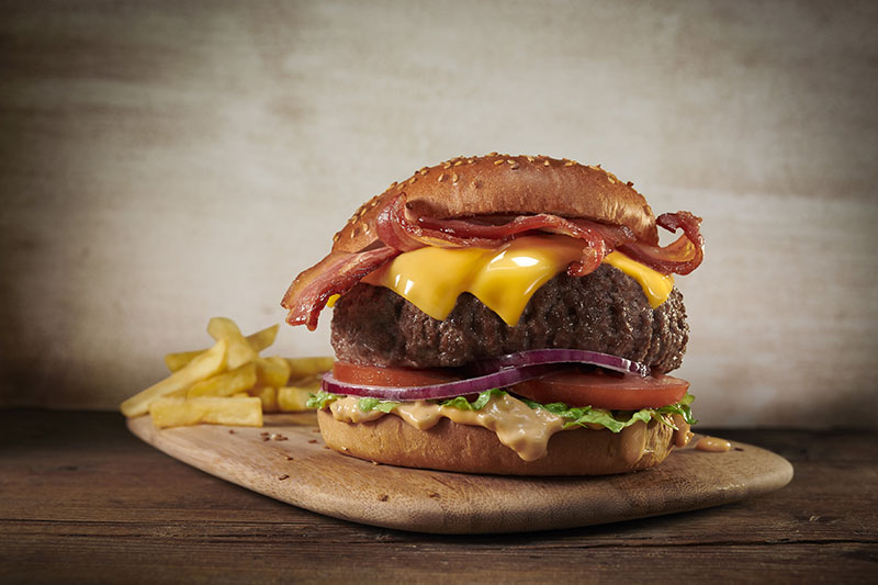-Queso cheddar, beicon ahumado con madera de haya, cebolla morada a la plancha, tomate, lechuga, pan clásico y mayonesa. ¡Para dentro!