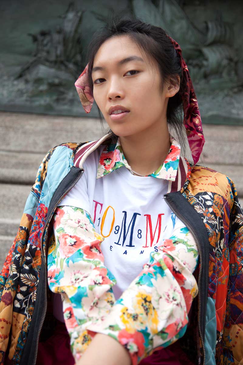 Pañuelo en el cabello de Urban Outftiters + Blusa de Zara + Camiseta blanca Tommy Jeans + Bomber reversible Free People