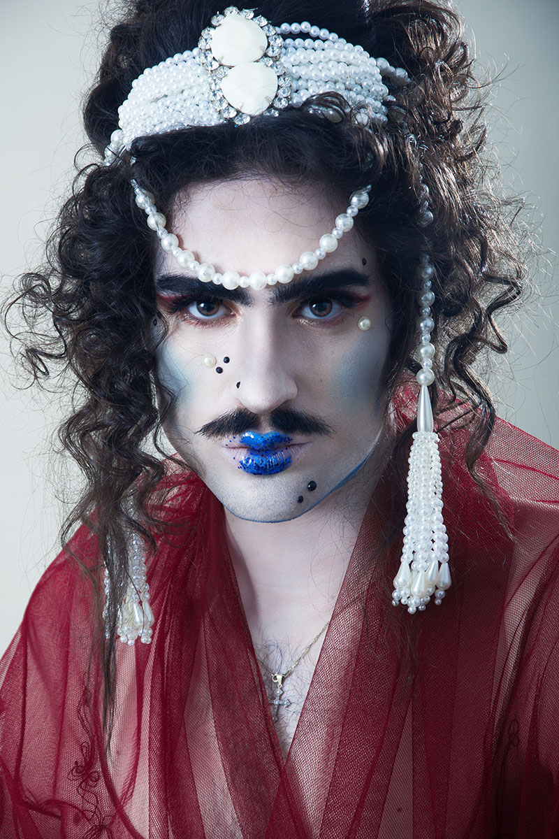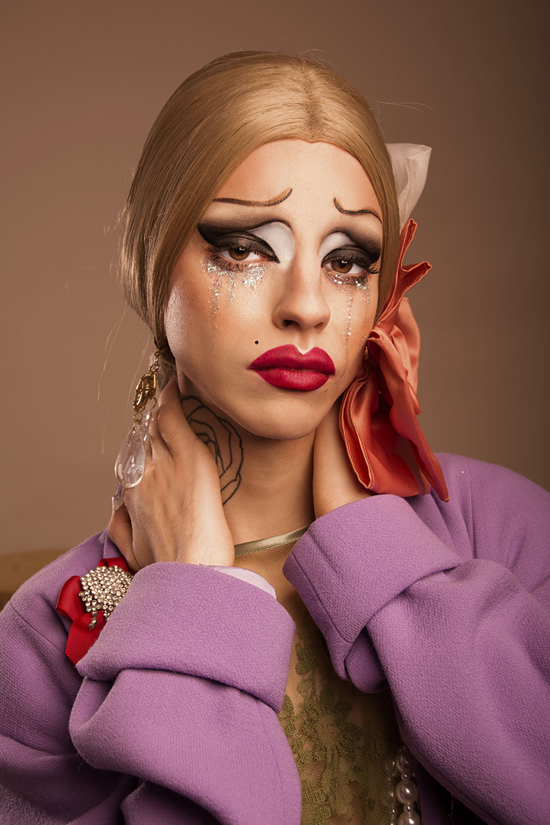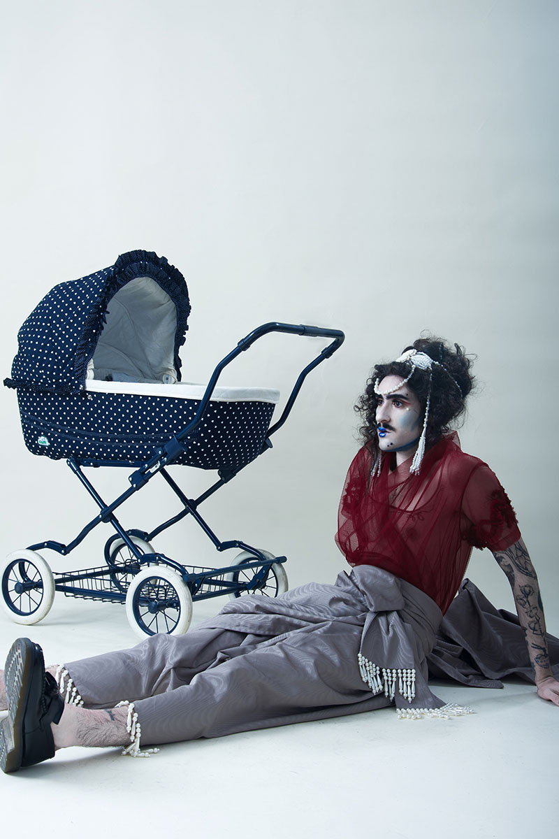 Foto Arriba: Edu lleva top, pantalones y accesorios de Guillermo Décimo + Zapatos Dr Martens.