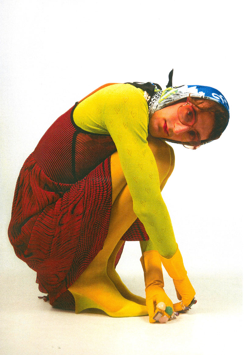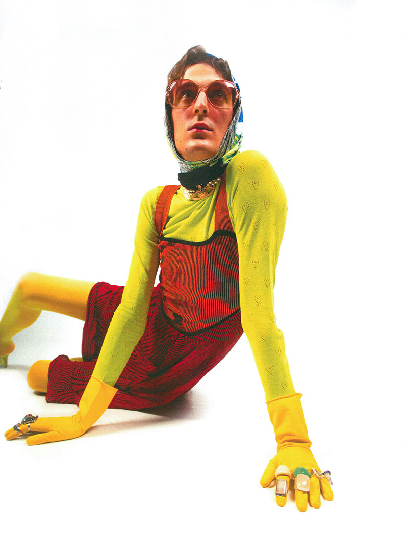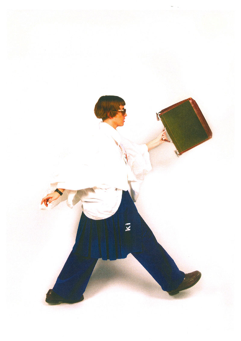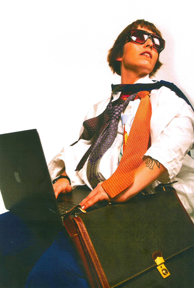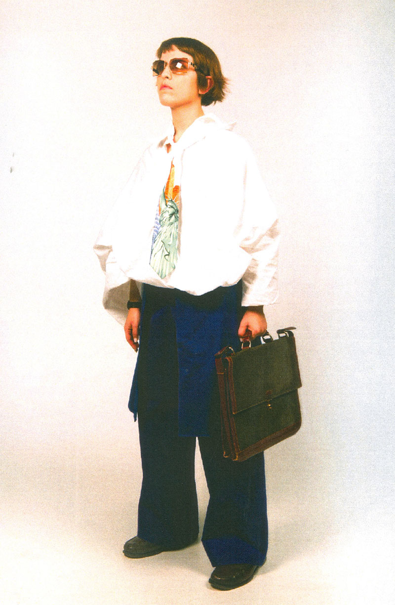 Foto Arriba: “El padre” lleva camisa de Meritxell Ventura + Kilt de Anna Andrevi + Pantalones de A Cold Wall + Bolso de Loewe Vintage + Gafas de Murcia + Corbatas vintage de Gianni Versace, Moschino y Givenchy.