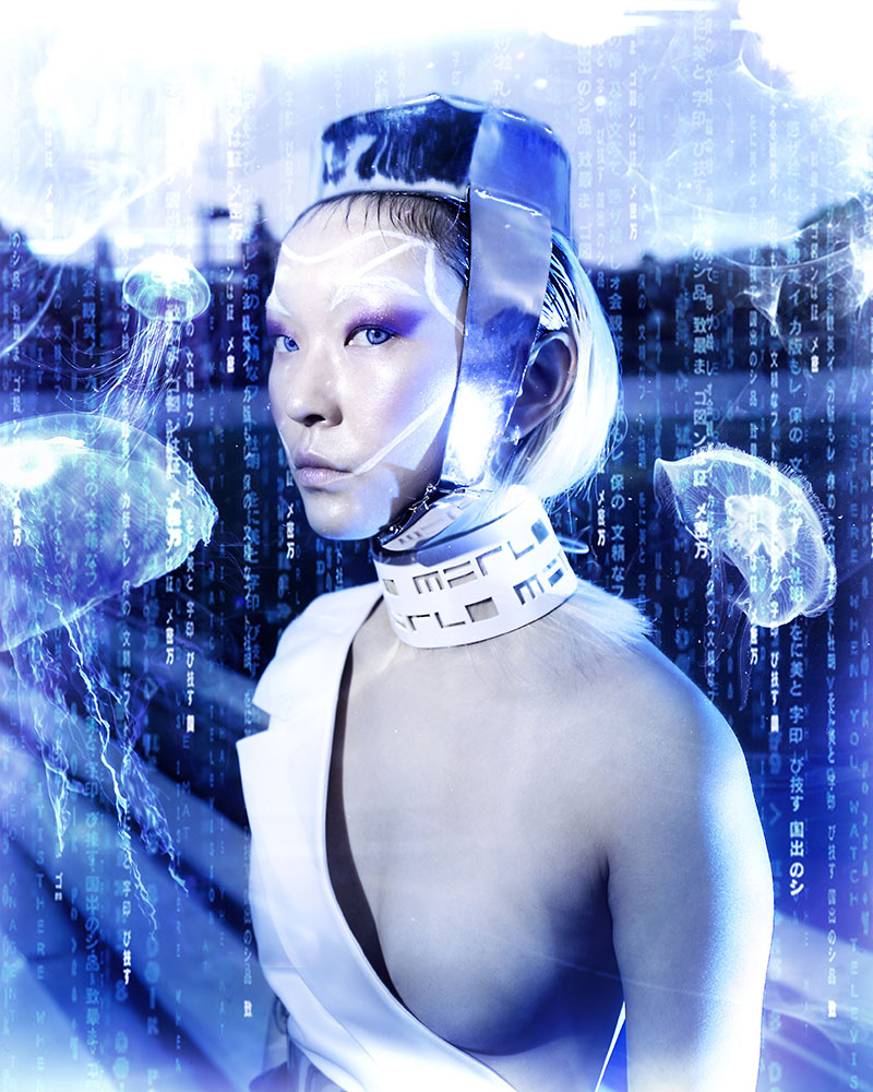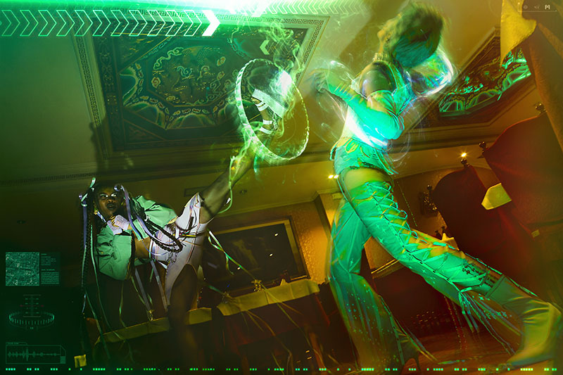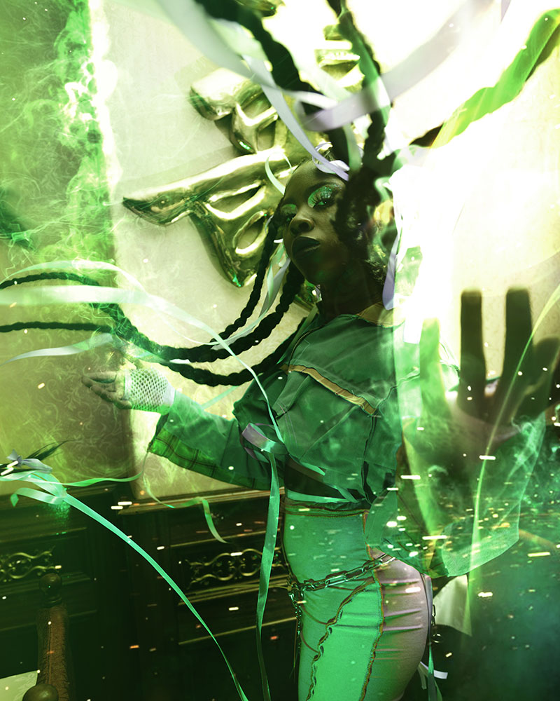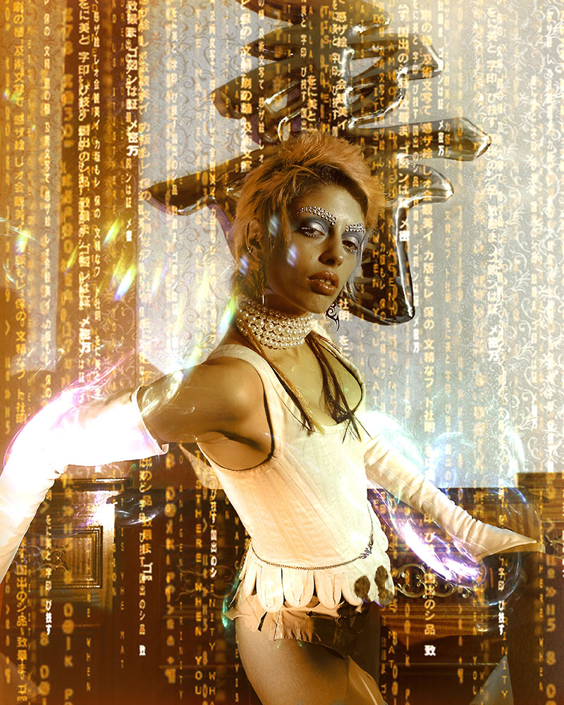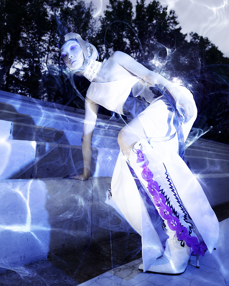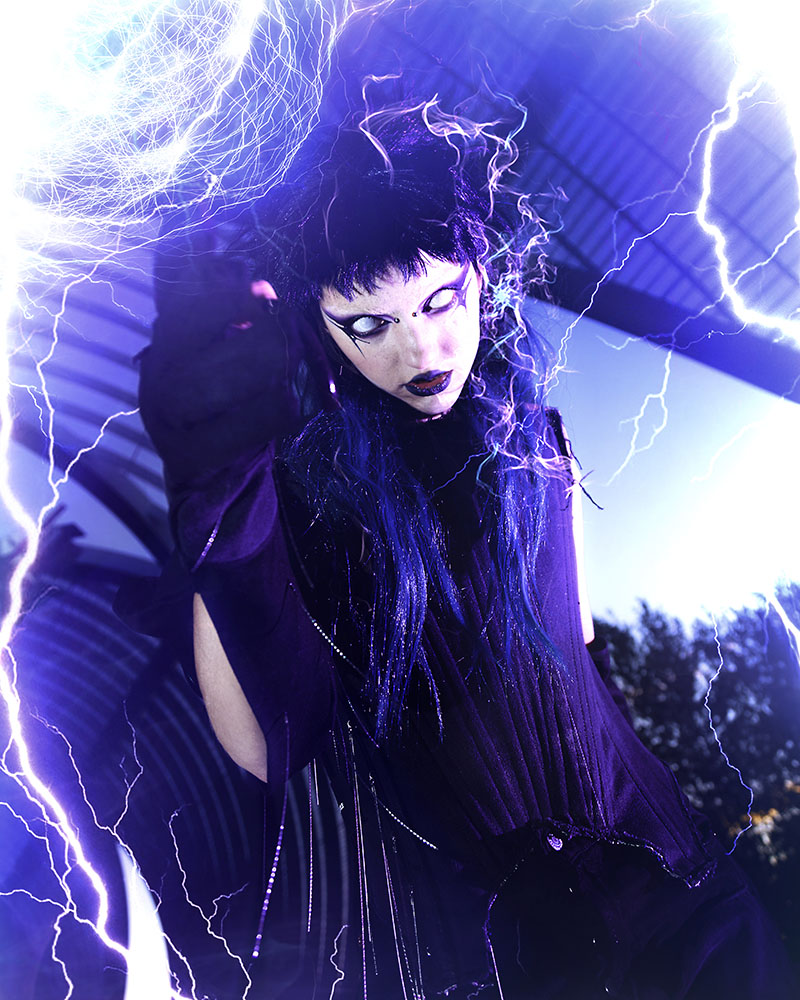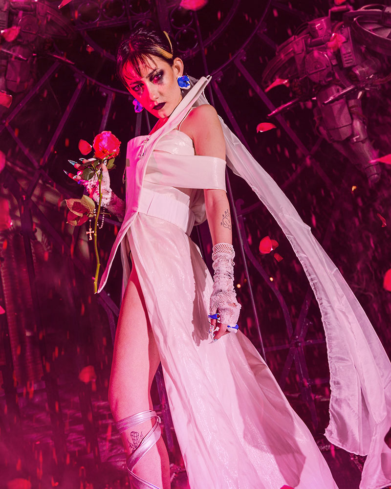 Foto Arriba: Kuranova lleva corsé de ManéMané + Body, guantes y perneras de Bluetoothgirl + Pendientes de bodychain de Nap Ravers. + Uñas de Sara Jimenez.