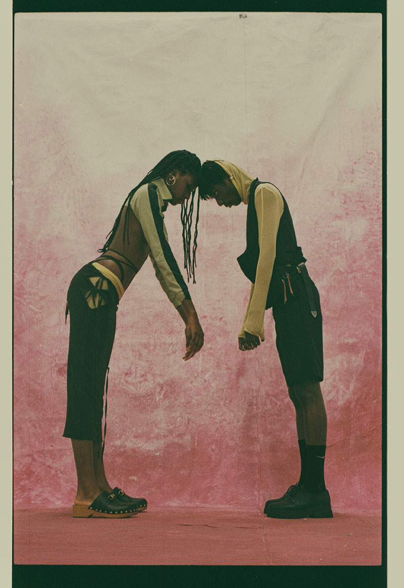 Foto Arriba: Loren lleva mangas IKAL + Falda asimétrica LICK DIABLO + Falda hecha a mano + Tanga OYSHO + Zuecos GUCCI + Ear cuff AVEC. Fernando lleva hoodie hecho a mano + Chaleco GUCCI + Funnybag PRADA + Pantalón de traje ANGEL GRAVE + Zapatos NECIO + Ear cuff AVEC + Calcetines NIKE