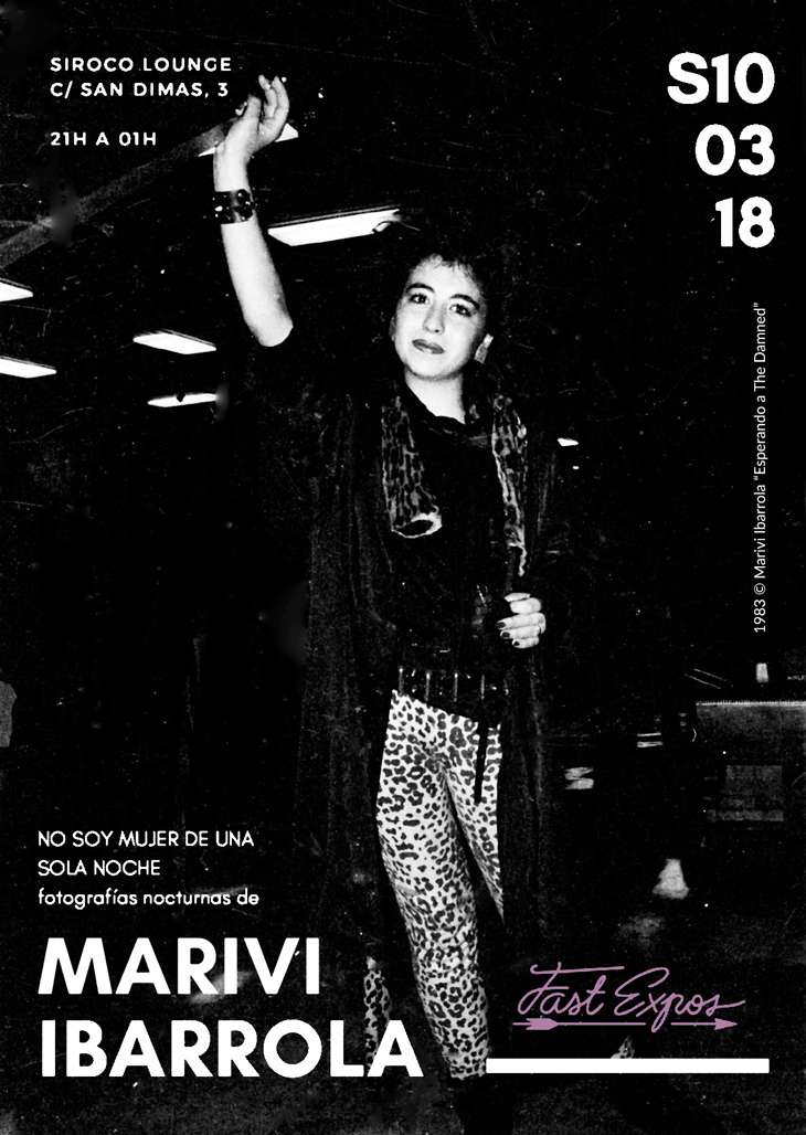 “Coincidiendo con la semana del Día Internacional de la Mujer, la fotógrafa y periodista que retrató la movida madrileña de los años 80, MarivI Ibarrola, hace una breve exposición fotográfica nueva e inédita dedicada a mujeres en la noche que fotografió en los años 80, que bajo el título “No soy Mujer de una sola noche, fotografías nocturnas”, reúne cerca de quince imágenes, donde se refleja en muchas ellas la actitud de féminas que marcaron tendencias . La duración de la exposición será solo de una noche, la del sábado 10 de marzo del 18 en la sala del Siroco, con un horario nocturno a partir de las 21 horas. Una muestra de las mujeres que poblaron la década de los ochenta en conciertos, saraos…, una selección de fotografías que documentan no solo la estética punk/rock, sino la actitud femenina que mantuvieron muchas protagonistas de aquella época. La noche fue compartida por mujeres olvidadas, que rescatamos aquí para la memoria. Fotografías de mujeres que encontramos en horario nocturno en el escenario, en la música, en el baño, en grupo, ante el espejo, en manifestaciones sociales o acompañadas de personajes… que ejercían de periodistas, pintoras, médicos, arquitectas que se estaban haciendo hueco en la década. En las fotografías están unas veces solas y otras en marcha, mujeres valientes que arriesgaron y se enfrentaron a la sociedad dominante en una joven democracia española, no solo con su vestimenta sino con sus acciones y actitudes. Que sirva cono pequeño homenaje y para abrir un diálogo para la historia, que la hacemos todos y todas.”