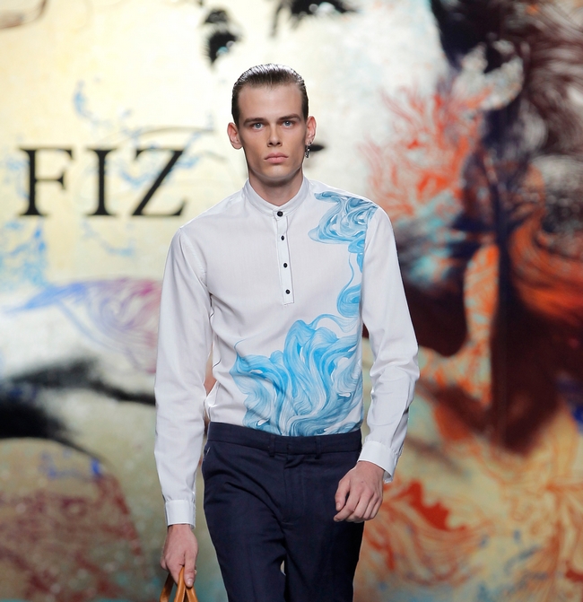 Pocas veces habremos visto sobre la pasarela madrileña que un ilustrador influya tanto en el estampado de un diseñador de moda. En el caso de Gabriel Moreno, observamos que la excepción confirma la regla y que el resultado no puede ser mejor. El vasco Ion Fiz lo eligió para que sus prendas exudaran ese espíritu marítimo que pretendía para su colección primavera/verano 2015, ‘Aftersun’, y decididamente ha dado con la horma a su zapato. Prendas versátiles y estampadas con motivos marinos en tonos celeste y coral abrieron el desfile de la última edición de MBFWM, al que seguirían pantalones altos, faldas con caída, mucha sastrería y alguna que otra asimetría en las siluetas. La presente, es la primera ocasión en la que el artista cordobés se alía con el diseñador vasco para darle la vuelta a la tortilla, en cuestión textil, a sus creaciones. Una colaboración exclusiva que evoca desde la primera salida, el dinamismo requerido a través de trazos sutiles que dibujan ondas y que nos inducen como la marea a elementos como la brisa, las dunas, los arrecifes y las olas tan recurrentes en el vocabulario estival. Una colección que no deja indiferente a nadie, que abre las puertas a Moreno hacia otros territorios nunca antes explorados y que nos ha descubierto (a lo grande) esos rostros imponentes erotizados, esas líneas femeninas que trabaja con tanta habilidad y esa belleza como norma, herramienta perfecta para un Ion Fiz en busca de ‘ese algo más’ frente a sus próximos clientes. ¡Enhorabuena!