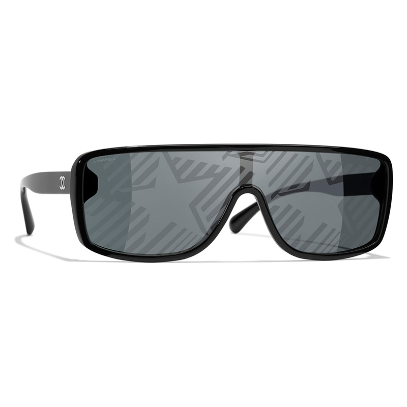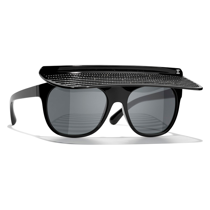 Esta propuesta de gafas de sol Chanel veraniegas resucita también una muy aclamada silueta; las Visor Sunglasses. Estas gafas negras mate de look vintage se coronan con un visor embellecido con pedrería que puede llevarse como una visera en horizontal o como una máscara llena de glamour y misterio si se baja.