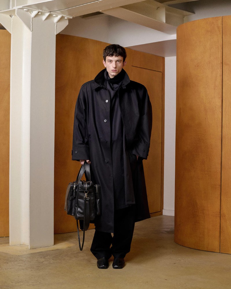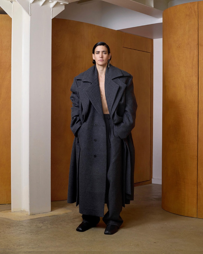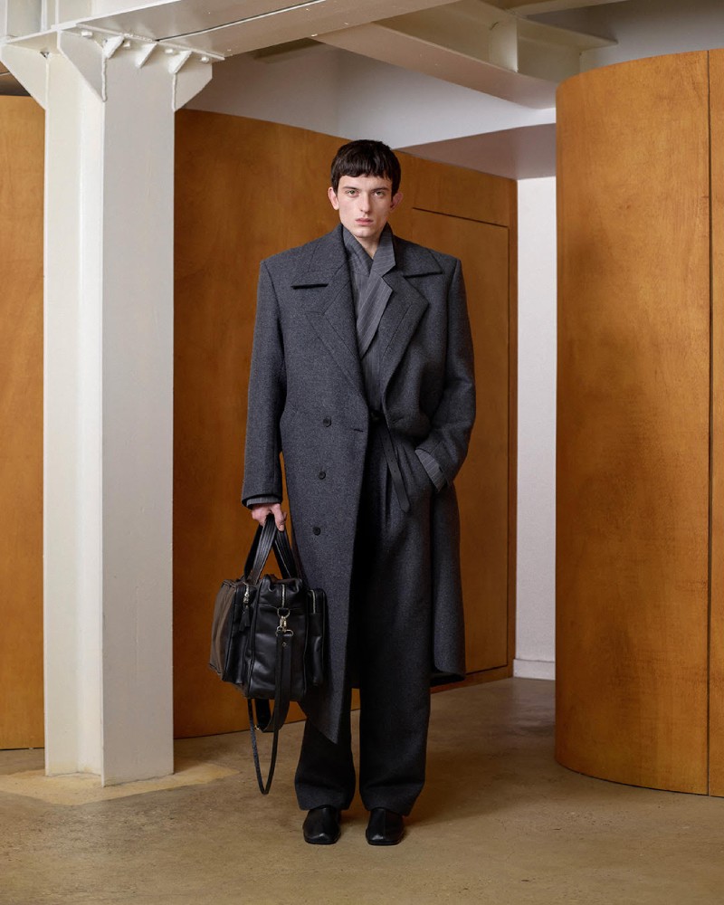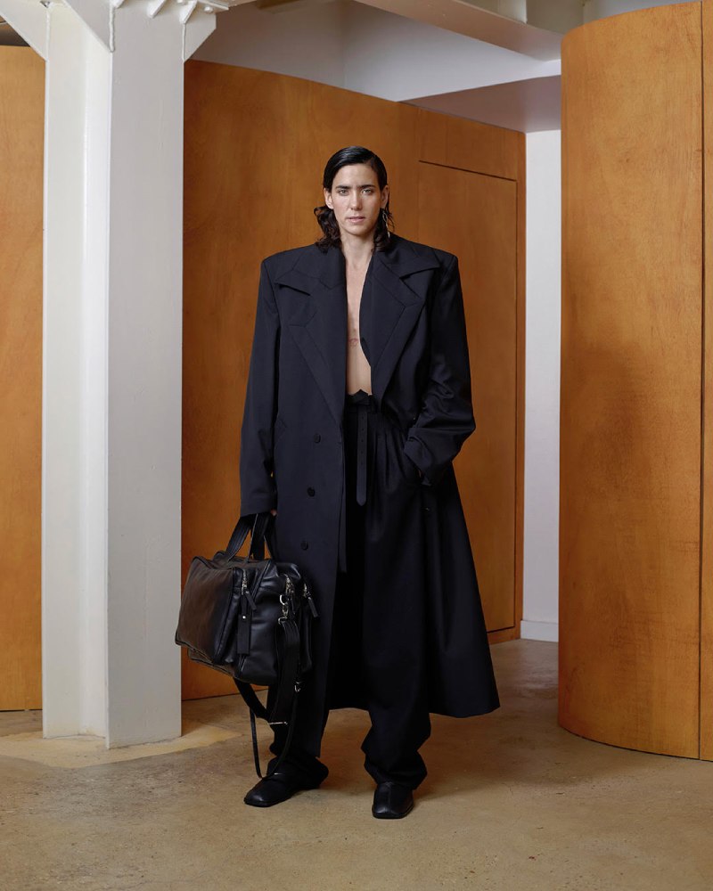 Gal Nell Dahan hizo su debut con una colección para Fw25 de espectáculo, donde la sastrería es la principal protagonista. Este nuevo armario sartorial-urbano y oversize abre con las piezas de outerwear, que hacen declaraciones fuertes desde la mesura y la sofisticación. Aquí, encontramos abrigos de lana con hombreras anchas y solapas dramáticamente oversize, acentuados por un largo dramático y botonaduras dobles. Como contrapunto más casual, tenemos parkas técnicas de inspiración militar clásica en la misma línea.