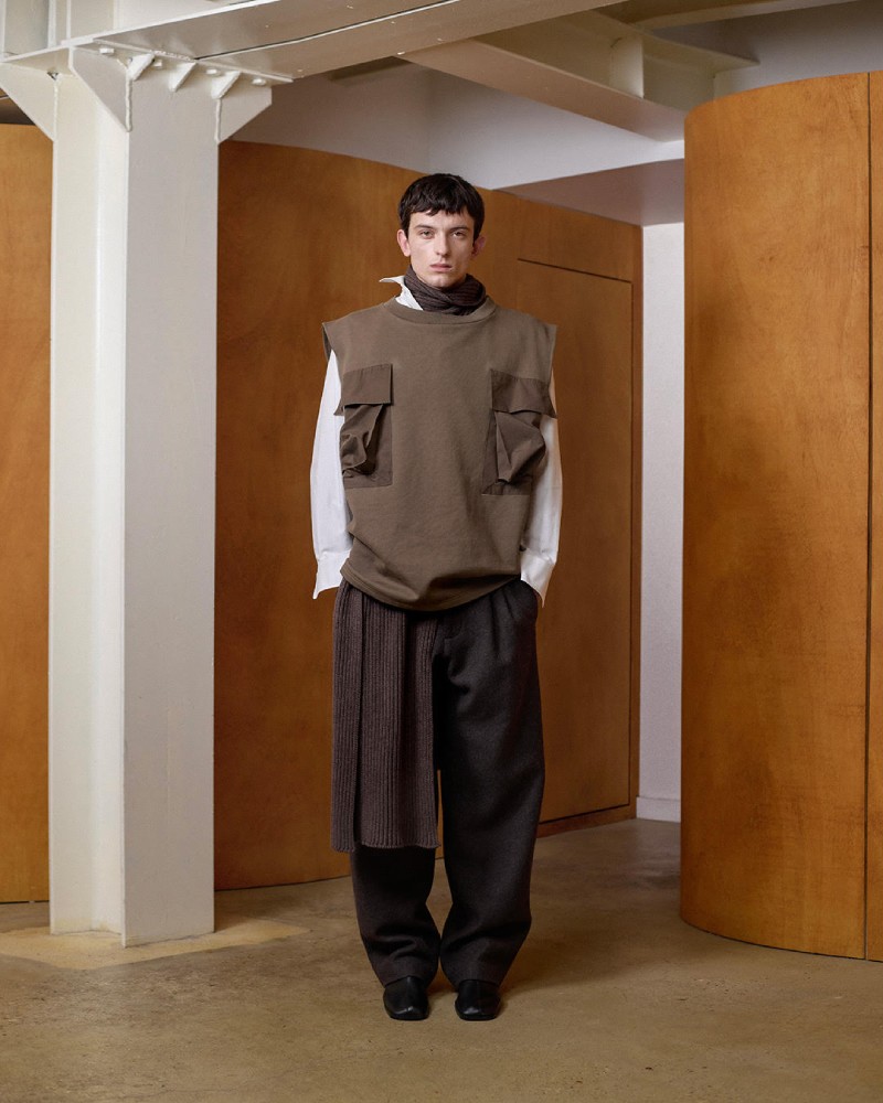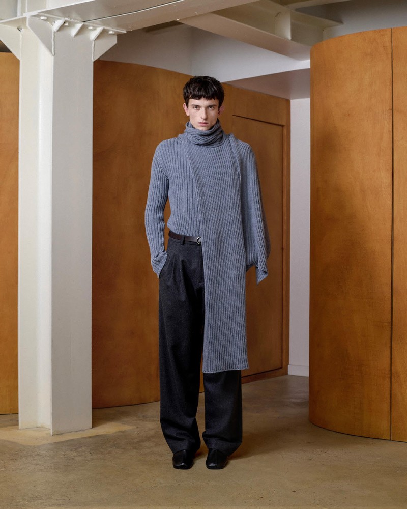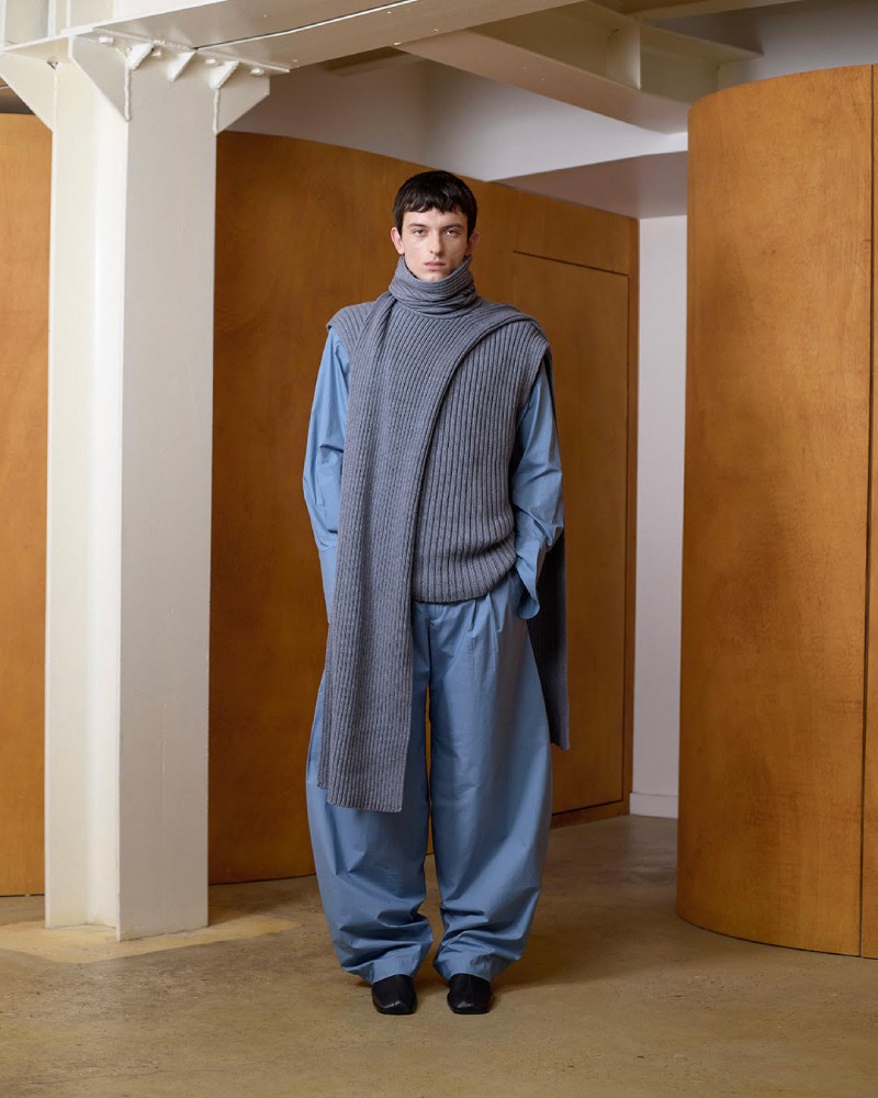 La colección de Gal Nell Dahan sigue con sus trajes. Estos conjuntos de neomenswear presentan también hombros anchos y pronunciados; pero modernizan la cuestión con solapas levantadas y pantalones de pinzas mucho más holgados. También, la americana experimenta una evolución al convertirse en un top, llevado dentro del pantalón para acentuar la silueta de la cintura. En esa misma línea deconstructivista, vemos también jerséis de punto convertidos en bufandas sobre sus homólogos convencionales y chalecos de inspiración utilitaria.