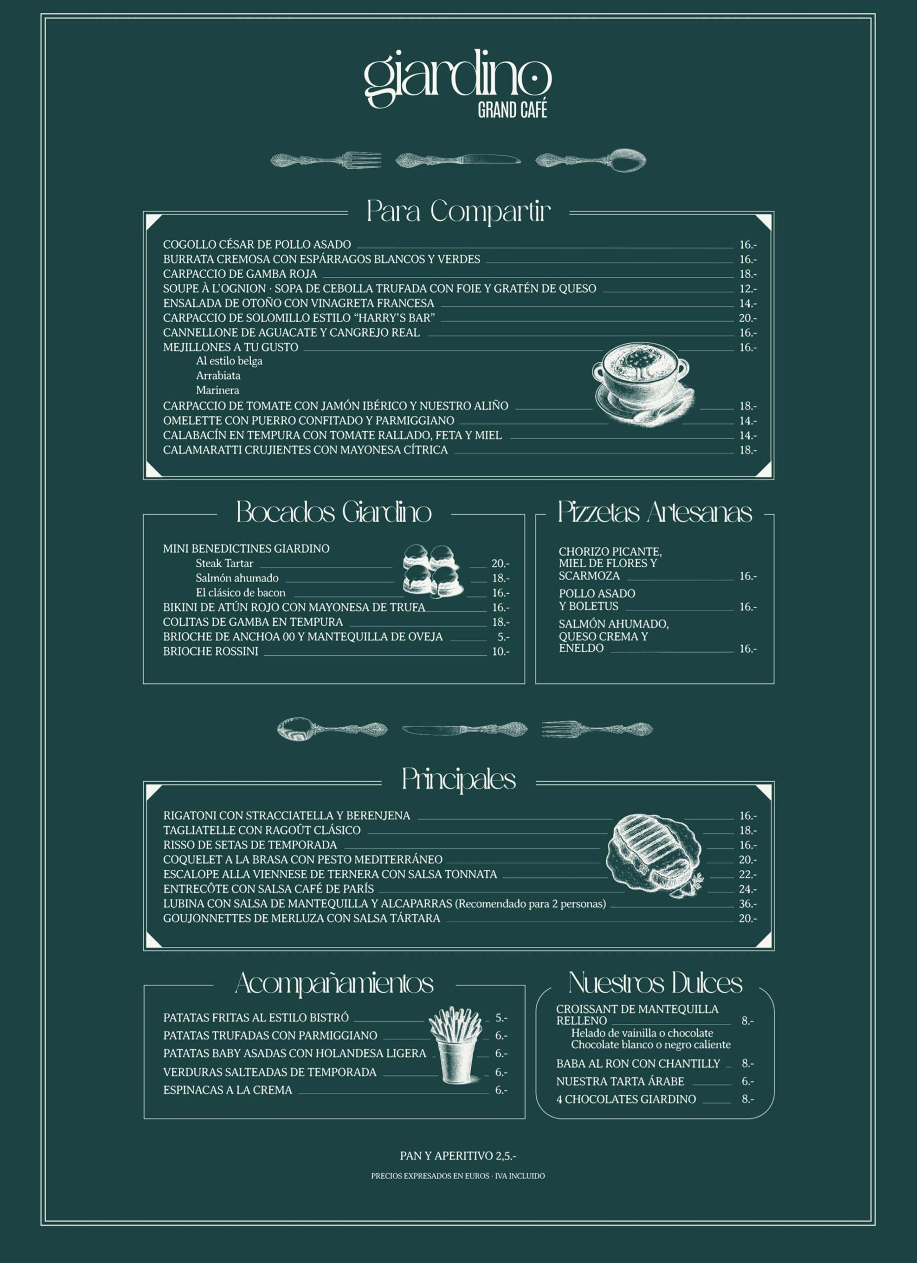 La teoría pasa a la práctica en “bocados Giardino”, todo un apartado dedicado a pequeñas tentaciones con claras aspiraciones al éxito. Para abrir boca, la carta enumera los Mini benedictines, que ajustan su precio según el topping -steak tartar (20 euros), salmón ahumado (18 euros) o bacon (16 euros)-, junto al Brioche de anchoa 00 con mantequilla de oveja (5 euros) o las Colitas de gamba en tempura (18 euros).