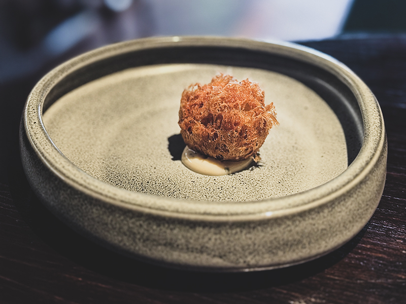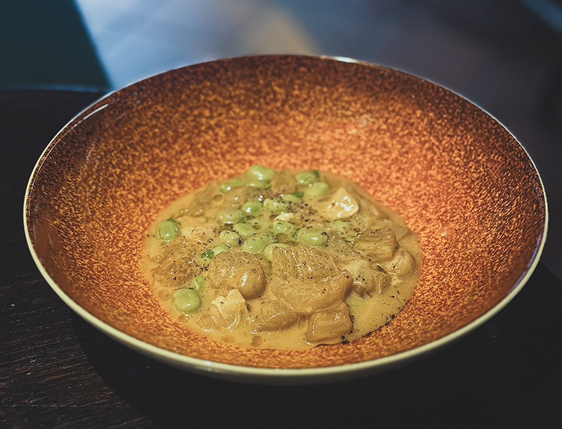 La fragilidad y la elegancia de la cocina de Chunlin Yu se condensan en una etérea Masa de taro frita, rellena de un guiso de ostra y kimchi (5€). Si algo define su proceso creativo es la obsesión, o quizá la necesidad, de unir sus dos culturas principales. De esa pulsión, nacen platos como el Guiso de tendones con habas tiernas y pilpil de bacalao (24€) sin duda una de las mejores elaboraciones del menú. Unos tendones poco habituales en la cocina mediterránea se cocinan durante horas hasta alcanzar una textura melosa, ideal junto al crujiente de las habitas. El pilpil aporta una untuosidad elegante y precisa.