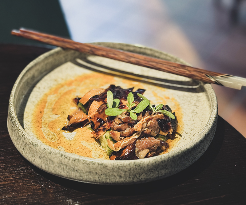 De la huerta trae su Berenjena dorada con glaseado agripicante (8€) una elaboración pensada para compartir. Se rebozan en harina de maíz y después reciben un golpe de freidora. Una vez fritas, se glasean con sésamo y pimienta de Sichuan. Aunque en los primeros bocados la pimienta acapara el protagonismo, pronto empieza a abrirse paso el sabor de la berenjena. Aunque esta elaboración no siga del todo la línea de las anteriores, merece la pena probarla