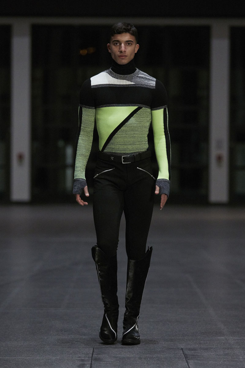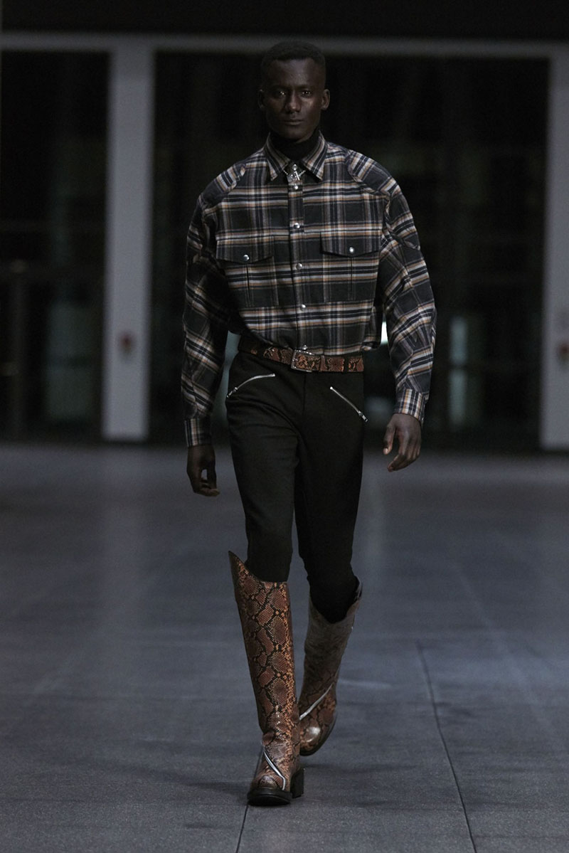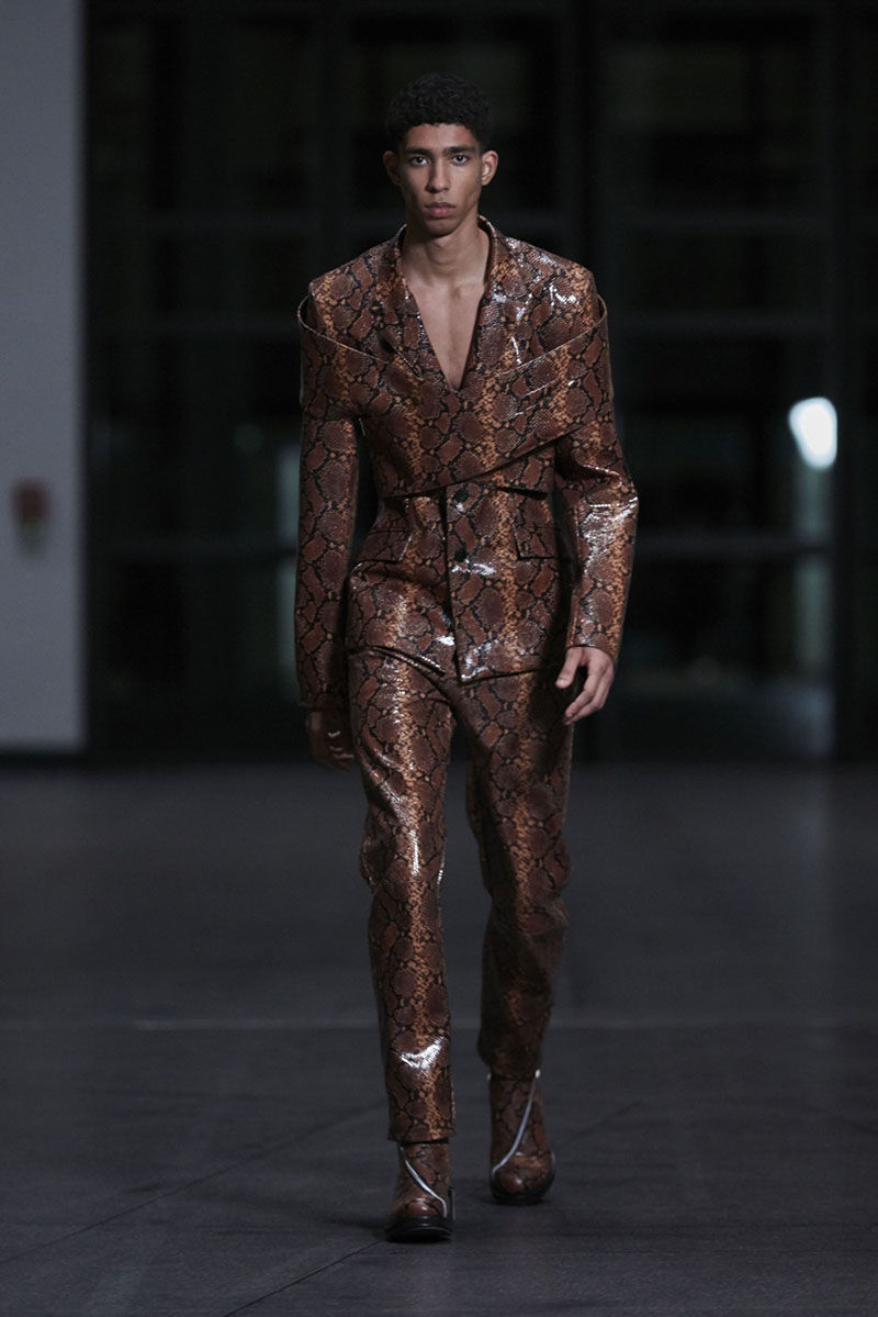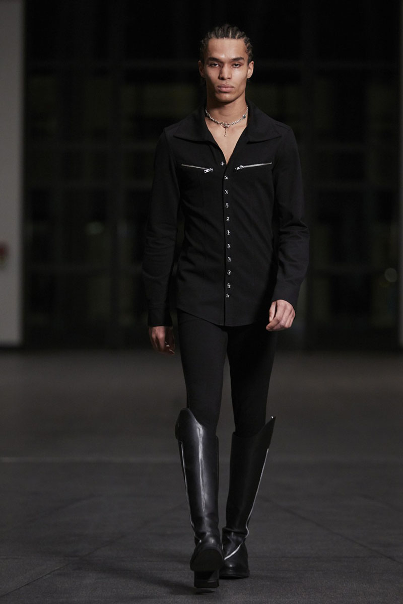 Además de presentar los looks que componen la nueva colección de GmbH FW21 Men’s, la firma está más que orgullosa de presentar su primera linea propia de calzado vegano, compuesto de diferentes versiones de un llamativo diseño de bota de caña alta asimétrico en negro mate, brillante y con estampado de serpiente. Sin duda una nueva pieza que se une a la familia GmbH y que acabará convirtiéndose en uno de sus iconos atemporales más codiciados.