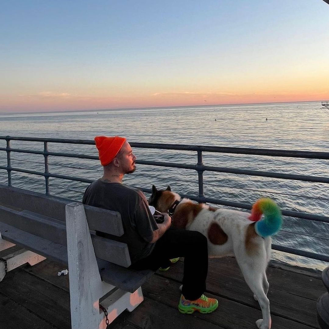 J Balvin con su perro mirando al mar tras la polémica de los Grammy Latino 2022. Foto vía Instagram