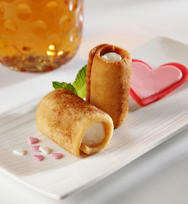 Preparación: se deshace la harina de maíz con la mitad del Granini Manzana. Se incorpora la otra mitad del Granini al fuego y cuando esté a punto de hervir añadimos la mezcla realizada previamente. Removemos hasta que espese y después reservamos. Hacemos una masa con el aceite, el moscatel, la harina y la cáscara del limón rallado, y la dejamos reposar una hora. Pasado este tiempo, hacemos pequeñas porciones de masa y las estiramos. Posteriormente, con la masa envolvemos un molde cilíndrico ‐previamente engrasado con mantequilla‐ y freímos con aceite a 180 grados hasta que se dore por ambos lados. Retiramos el canutillo del molde y dejamos enfriar. Repetimos la operación hasta acabar la masa. A continuación, rellenamos los canutillos con la crema de manzana y los pasamos por azúcar y canela. Estiramos los dos fondants y con ayuda de dos cortapastas con forma de corazón hacemos diferentes medidas que podemos sobreponer para decorar el plato.