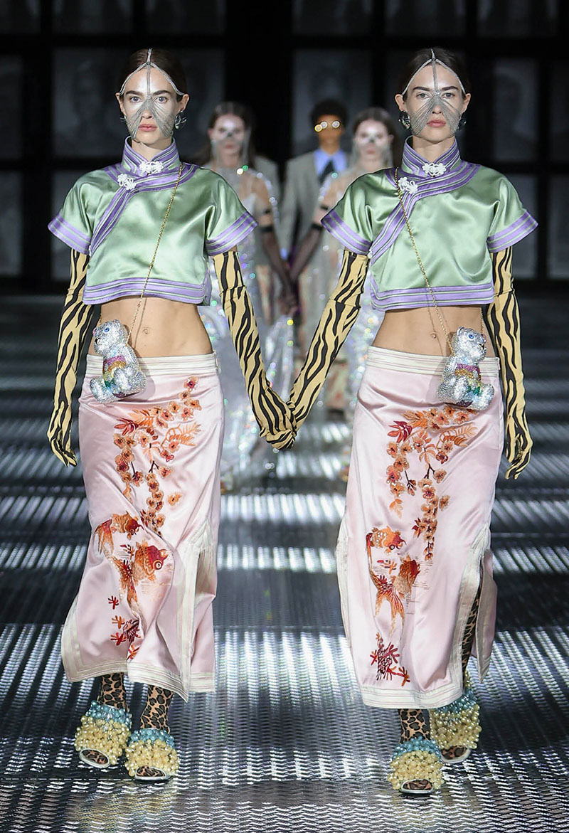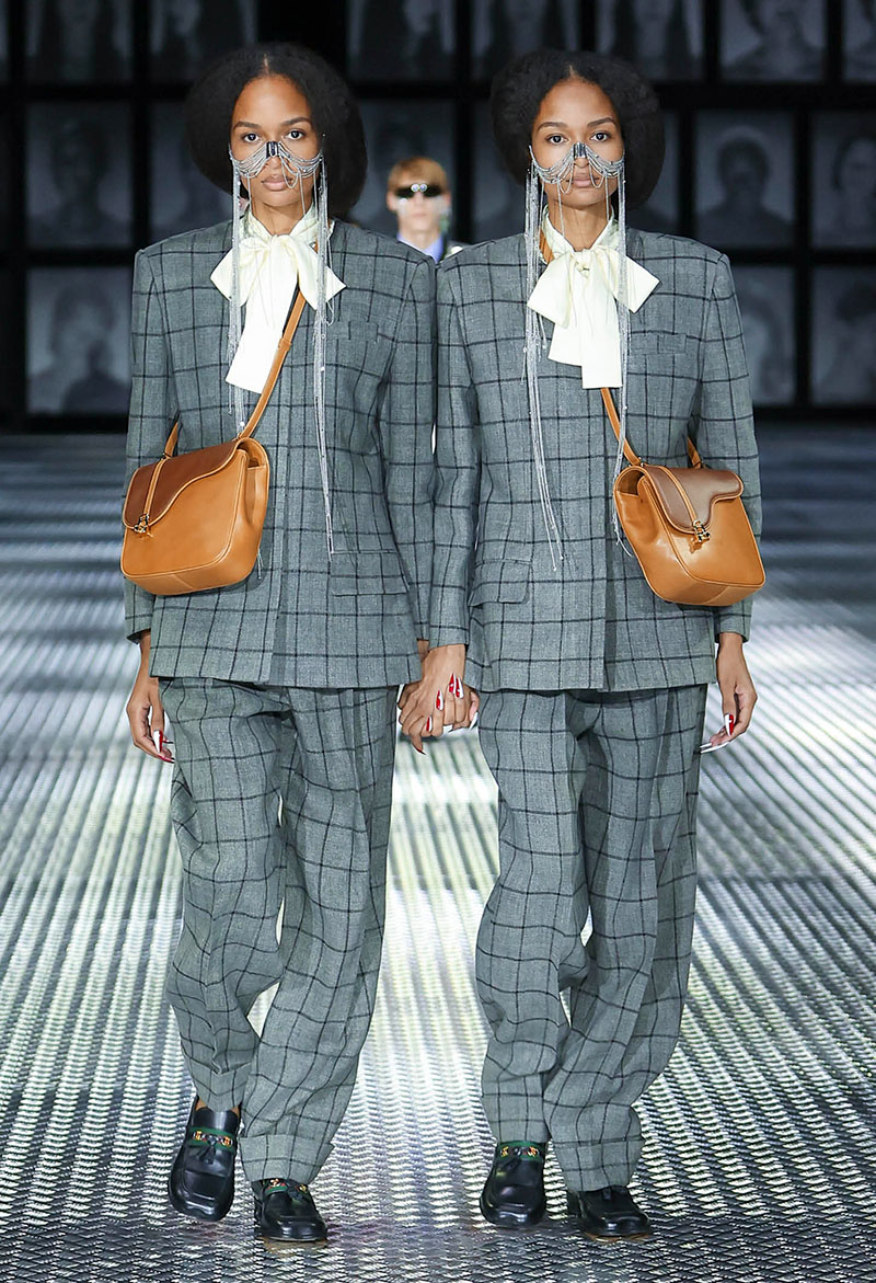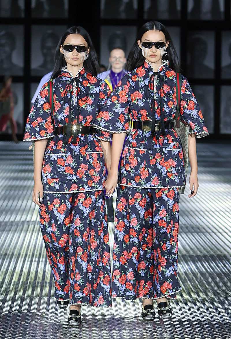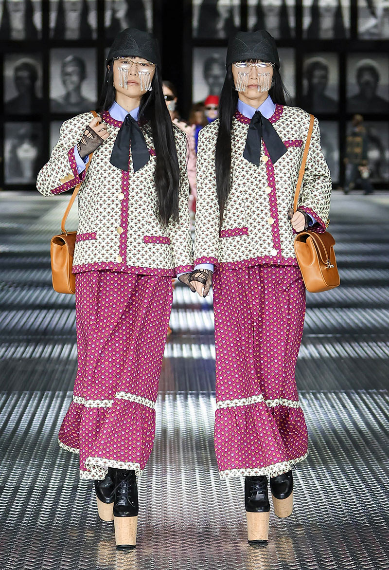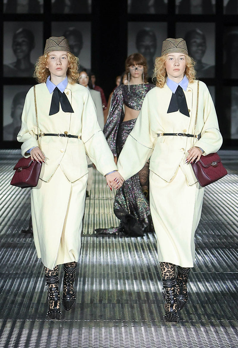 A lo largo de la pasarela, 68 parejas de gemelos defendieron sus respectivos 68 looks por partida doble creando un efecto hipnótico y muy llamativo que hacía incluso que los diseños perdieran su evidente singularidad. Desde volátiles vestidos, pasando por conjuntos de dos piezas en los que se mezclan diferentes texturas y estampados, y sin dejar a un lado las imprescindibles piezas de tailoring reinventadas llenas de detalles y superposiciones al más puro estilo Gucci.