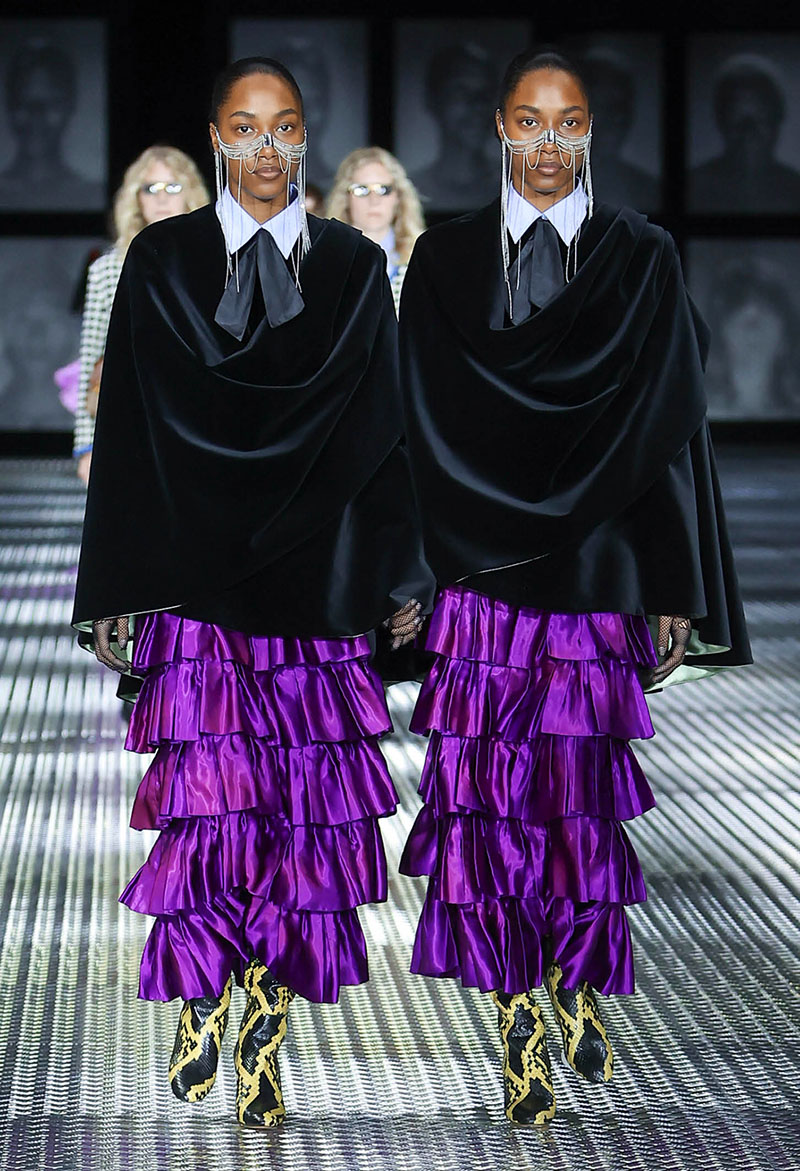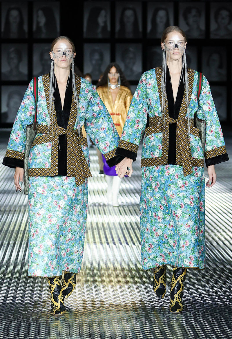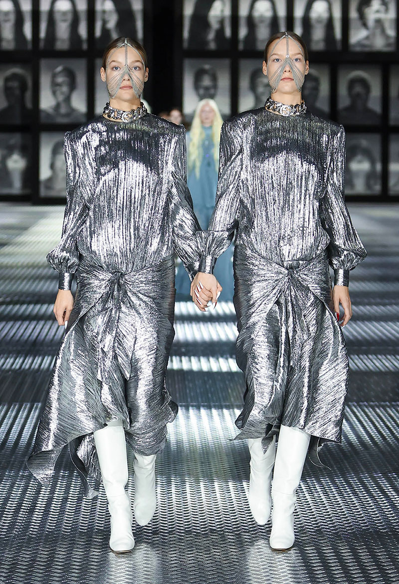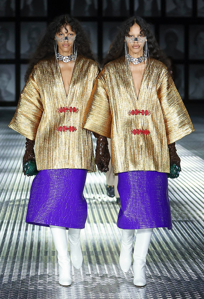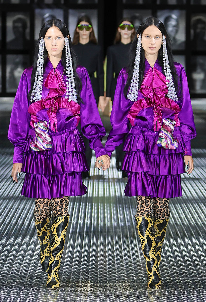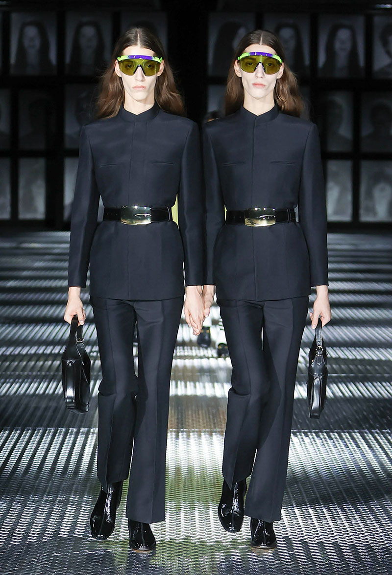 A lo largo de la pasarela, 68 parejas de gemelos defendieron sus respectivos 68 looks por partida doble creando un efecto hipnótico y muy llamativo que hacía incluso que los diseños perdieran su evidente singularidad. Desde volátiles vestidos, pasando por conjuntos de dos piezas en los que se mezclan diferentes texturas y estampados, y sin dejar a un lado las imprescindibles piezas de tailoring reinventadas llenas de detalles y superposiciones al más puro estilo Gucci.