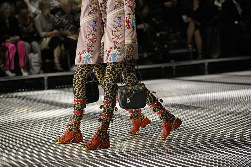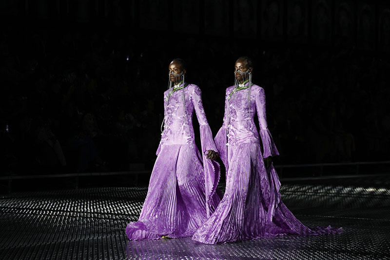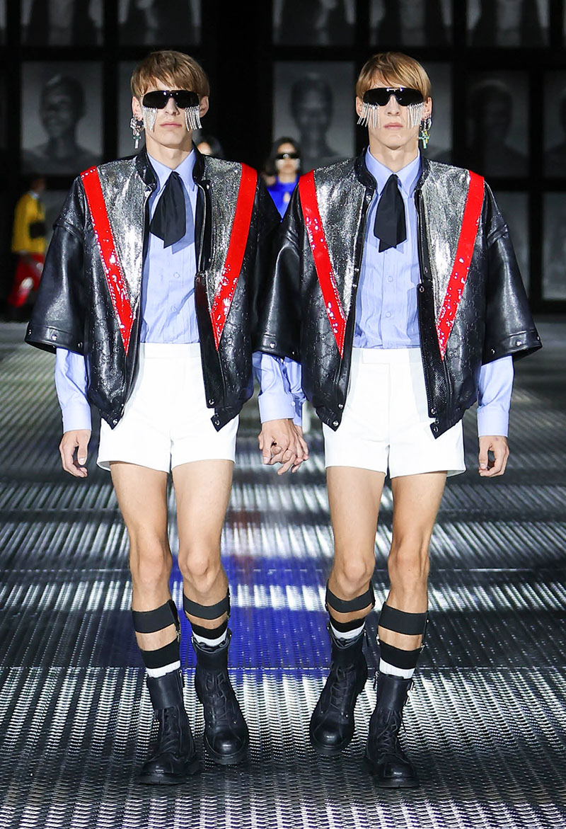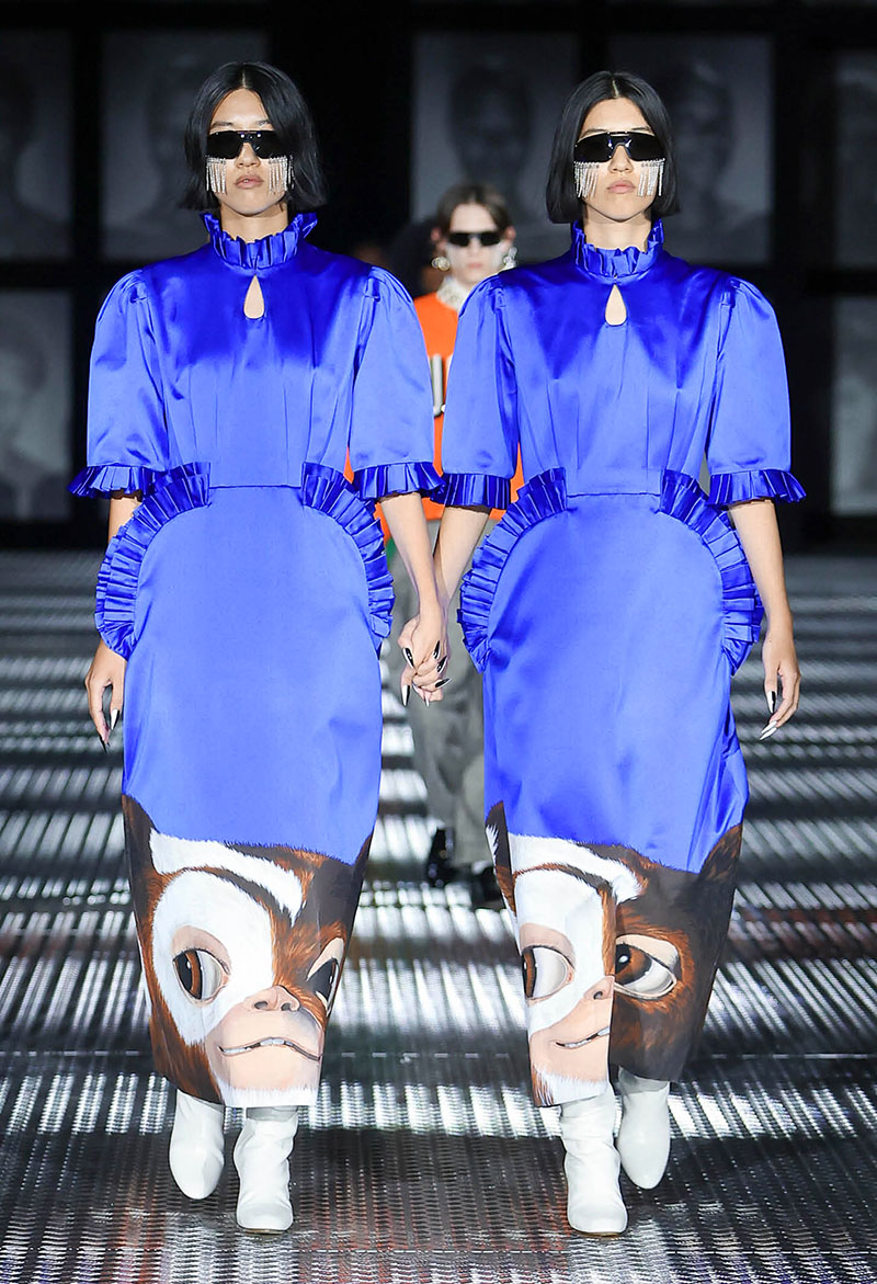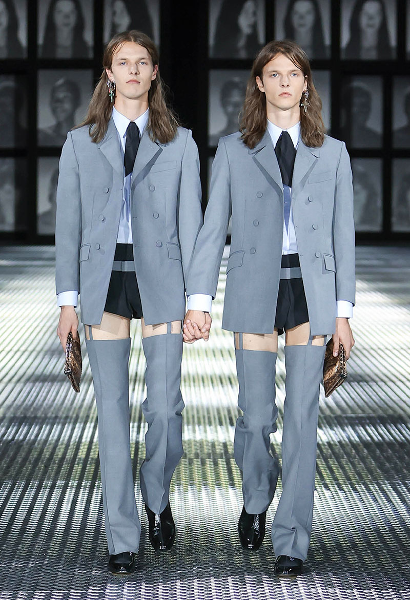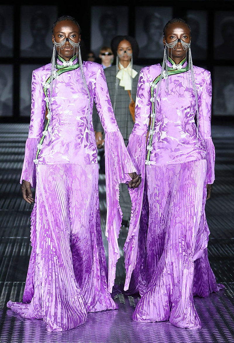 A lo largo de la pasarela, 68 parejas de gemelos defendieron sus respectivos 68 looks por partida doble creando un efecto hipnótico y muy llamativo que hacía incluso que los diseños perdieran su evidente singularidad. Desde volátiles vestidos, pasando por conjuntos de dos piezas en los que se mezclan diferentes texturas y estampados, y sin dejar a un lado las imprescindibles piezas de tailoring reinventadas llenas de detalles y superposiciones al más puro estilo Gucci.