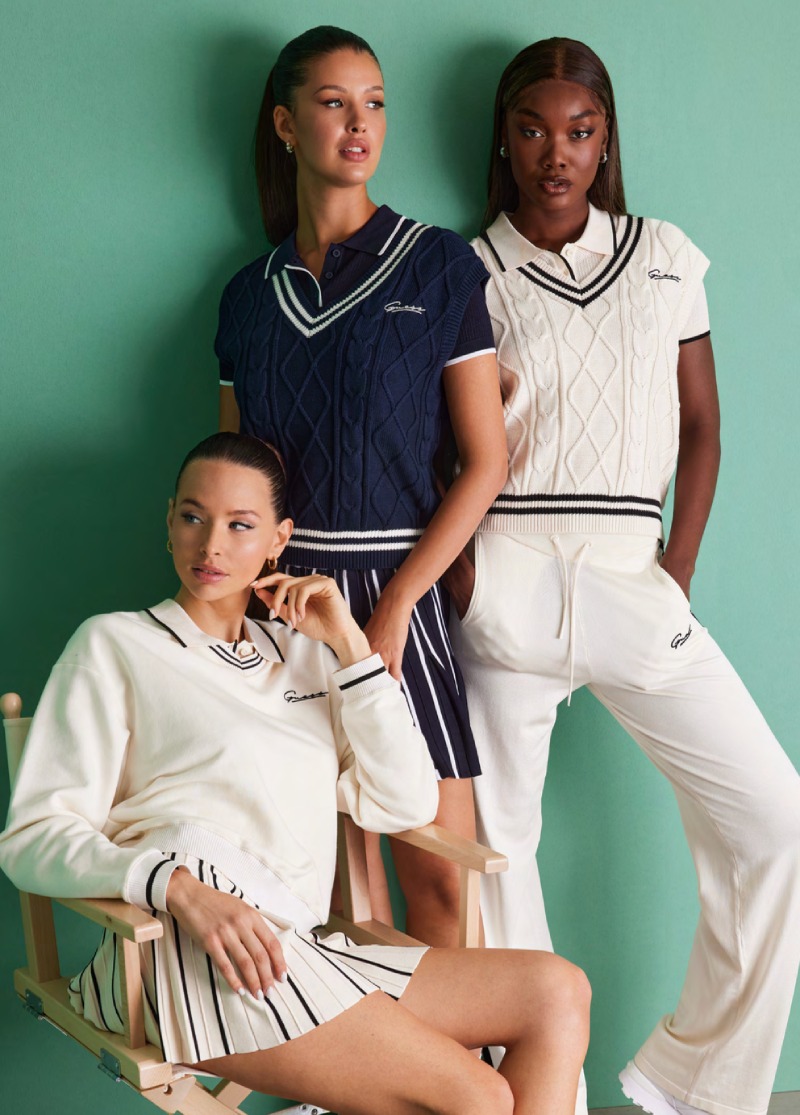 Las tendencias urbanas de SS25 para chica apuestan por un mood completamente diferente. Ahora, Guess propone una reinvención del estilo old money y la inspiración tenista a través de bajos más cortos y proporciones más oversize (conjugadas con otras más ceñidas). El look estrella de esta propuesta está compuesto por una falda de tablas, una camisa de polo blanca y una sudadera crew o un chaleco de punto de ochos. En la misma línea, tenemos conjuntos de chándal de chaqueta ceñida con pantalón acampanado y vestidos estilo polo. Y ya como puntillo más de Y2K, tenemos más chándal… pero ahora con brilli brilli.