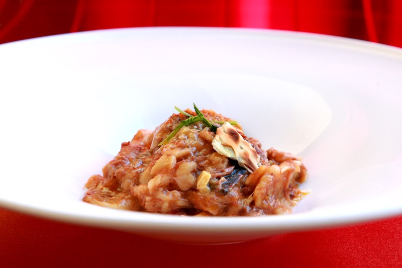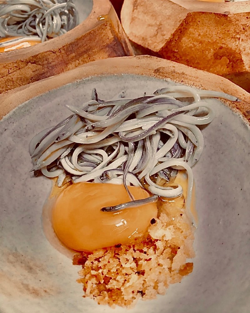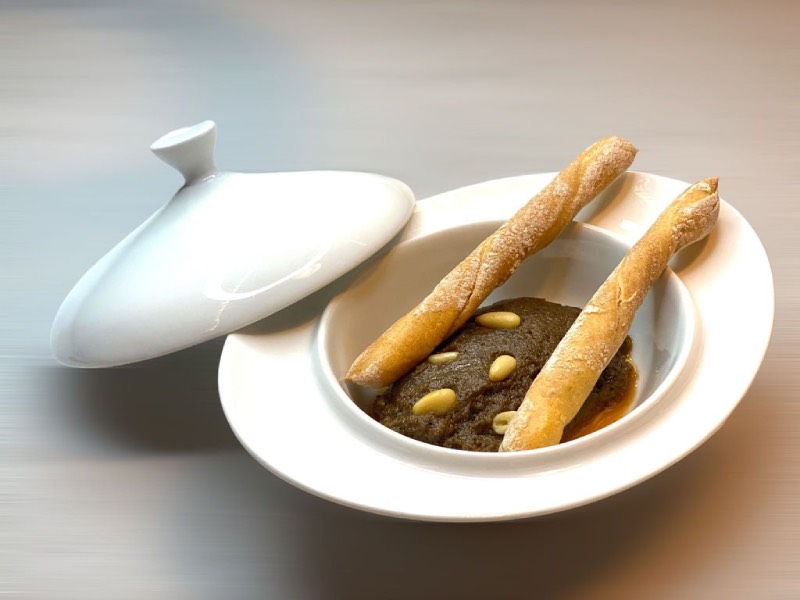 Otra sorpresa llegó con la Piñonada con Caviar Tibet, uno de los más arriesgados de la casa. Como su propio nombre indica, el piñón es absoluto protagonista: consiste en una leche tostada de piñones acompañada de una mouse de piñones con piñones fermentados -piñones por doquier, como podéis ver-, contrastado a la perfección con el potente pero exquisito sabor del caviar.