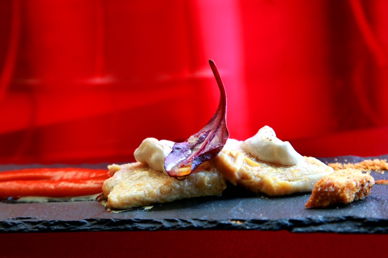 Imposible pasar por alto la original “tabla de quesos” que ofrece este restaurante. Denominado “Que te la den con queso” y, según nos confesó Cristina, es uno de manjares favoritos de la clientela. Disfrutamos de una selección de 4 quesos de grandísima calidad -todos procedentes de Albacete- encapsulados en esferas: Queso joven de oveja con mantequilla tostada y polvo de vino tinto; Bombón de queso Manchego con manteca inficionada al romero; Queso de cabra con corteza enmohecida con ceniza y Buñuelo de Queso de oveja azul.