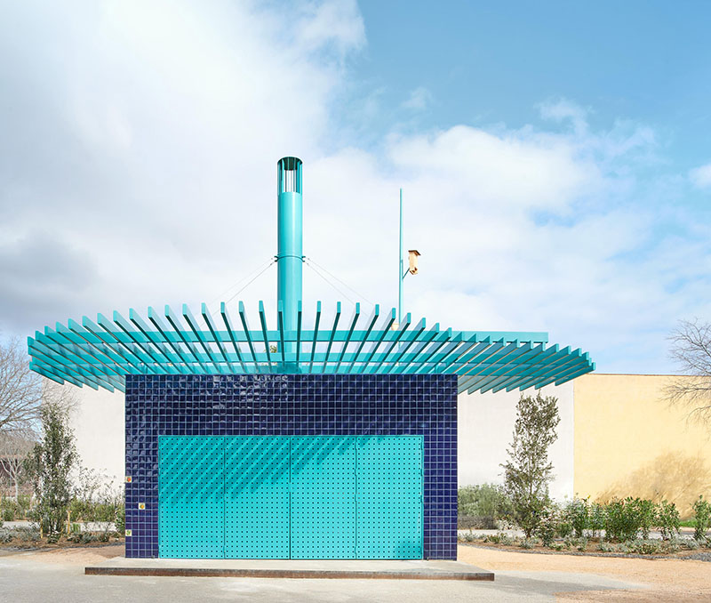 El alargado tubo de la chimenea sirve para evacuar los humos de la barbacoa y, a la vez, aporta rotundidad geométrica a la estructura, pintada en un alegre azul cielo. Para proporcionar sombra adicional, el diseño incorpora una pérgola metálica acabada en el mismo tono, que destaca por su grácil forma orgánica.
