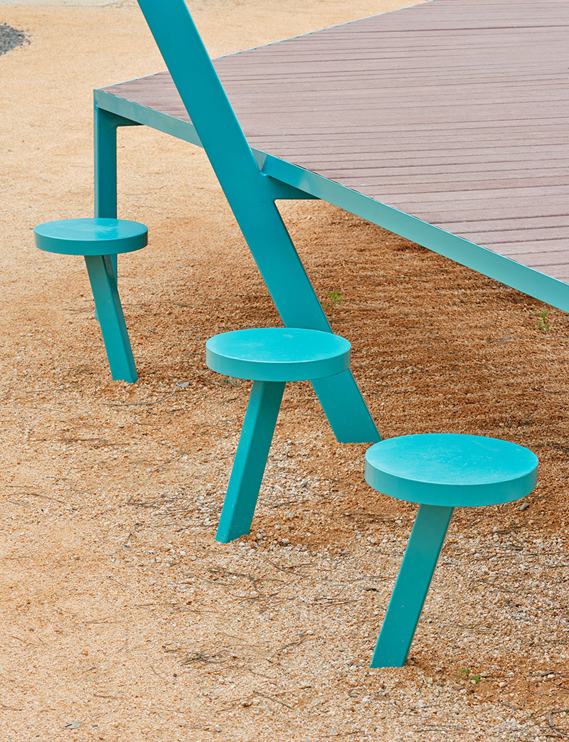 El principal elemento de mobiliario urbano que da vida a la intervención es una larga mesa merendero con capacidad para cincuenta comensales. Diseñada ex profeso por h3o architects, su tablero en forma de zigzag recorre con dinamismo el espacio, dejando una impronta lúdica en el entorno.