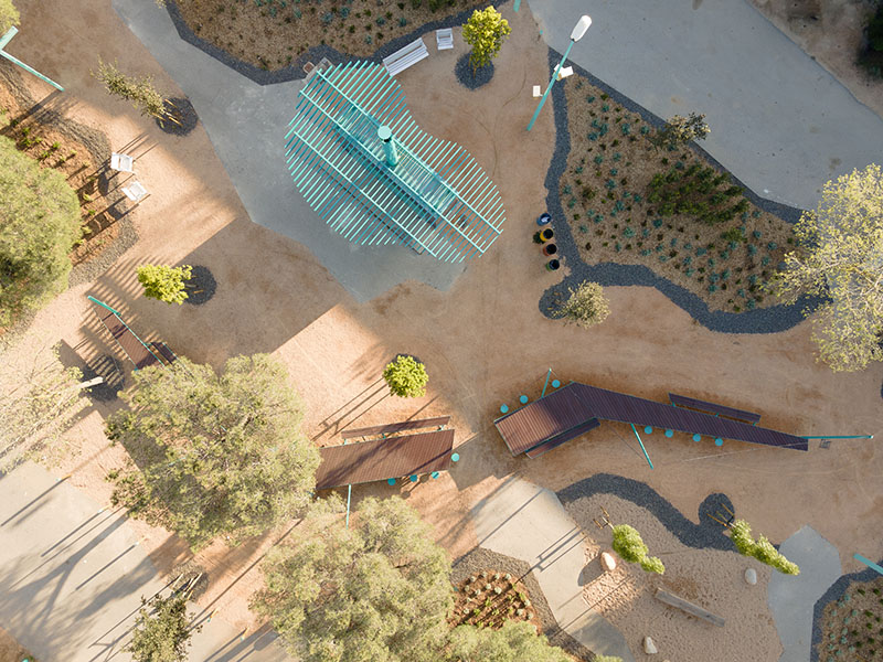 El proyecto integra nuevas especies de árboles autóctonos, que han sido plantados para consolidar la plaza como zona verde. Asimismo, se ha retirado la mayor parte del pavimento de asfalto, contribuyendo a la creación de un espacio en armonía con la naturaleza, que además es mucho más fresco en verano. Caminos y arriates con rocas completan la propuesta de paisajismo de este nuevo punto de encuentro, que recupera la esencia original del lugar a partir de una intervención pequeña que se hace grande.