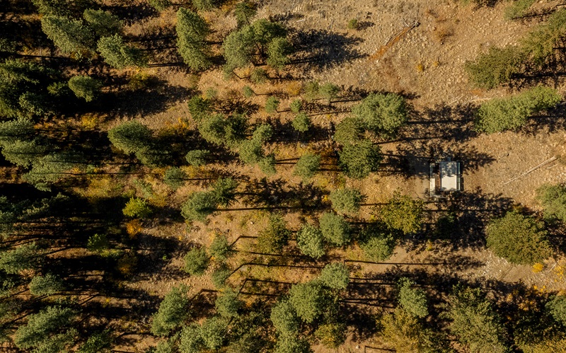 El equipo de GO’C ha emplazado estratégicamente el volumen en el lado sur de la ladera, apoyado sobre una losa de hormigón. El frente orientado al sur está formado por un gran ventanal de cristal por el que entra abundantemente la luz. Sus puertas correderas pueden abrirse, creando el efecto de proyectar los interiores a la inmensidad del paisaje e invitando a sentarse a tomar el sol en el exterior. En cambio, los tres laterales del habitáculo que limitan con la inclinada pendiente del terreno son opacos. Se trata de muros de contención construidos con hormigón in situ para sostener las tierras.
