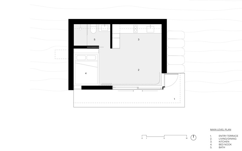 El diseño de Tinyleaf potencia las conexiones con el paisaje. El porche que recorre toda la fachada sur da cobijo a una agradable terraza exterior, al mismo tiempo que sirve para proteger el gran ventanal de la incidencia directa del sol y resguardar la puerta de entrada. Por otro lado, la cabaña cuenta con un leñero en uno de los laterales, destinado a almacenar los troncos para la lumbre. Y también dispone de un canalón que permite retirar el agua de la cubierta plana en época de lluvias.