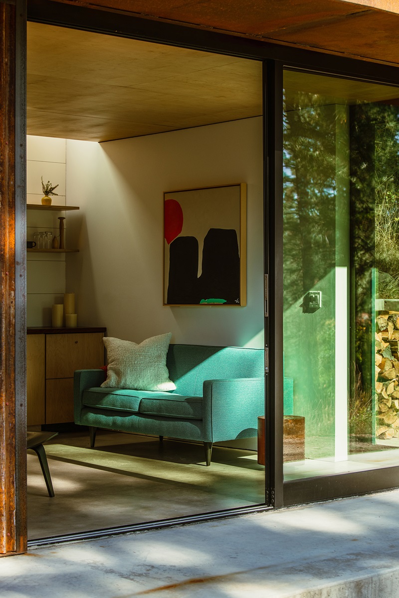 Además del hormigón y la madera, el otro material que integra Tinyleaf es el acero corten, utilizado en los paneles corrugados que singularizan la estética de la fachada y en la plancha metálica que conforma el porche. El material se caracteriza por su acogedor color, cargado de matices rojizos y anaranjados, su alta resistencia y su poco mantenimiento. Unas cualidades que le confieren una elevada capacidad de adaptación, posibilitando que la arquitectura envejezca y se mimetice cada vez más en el paisaje con el paso del tiempo.