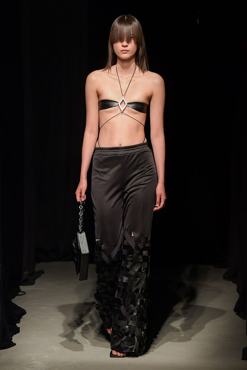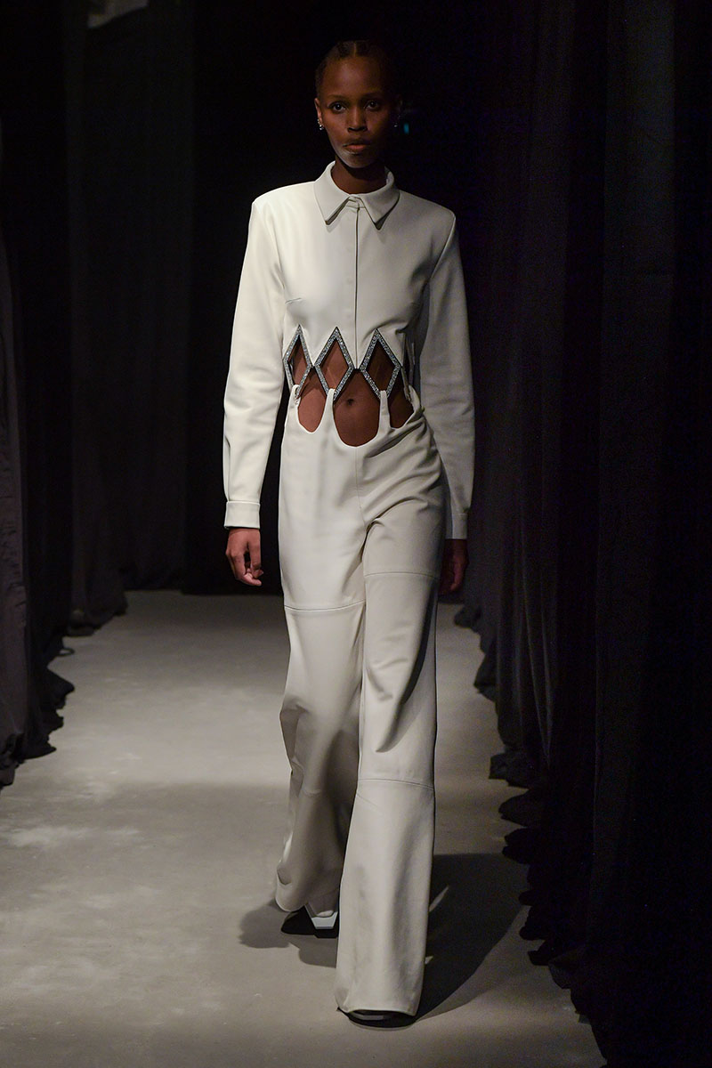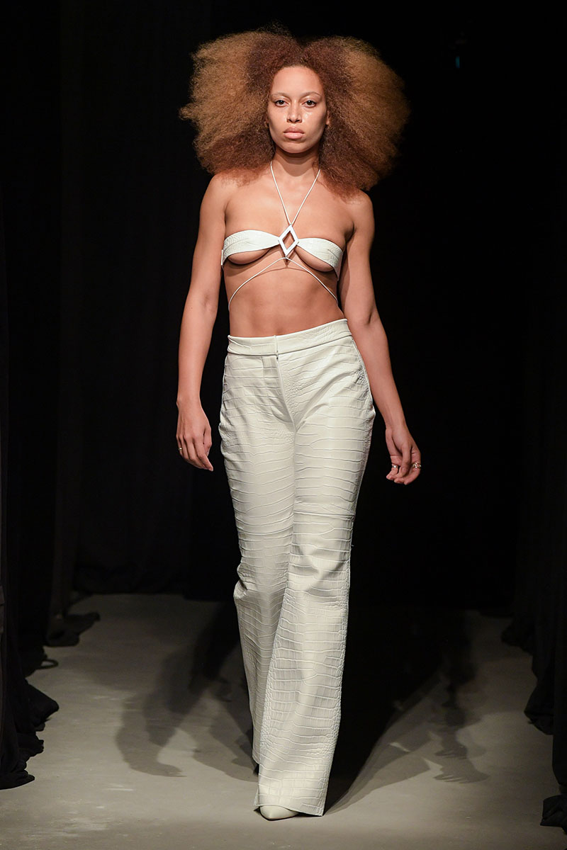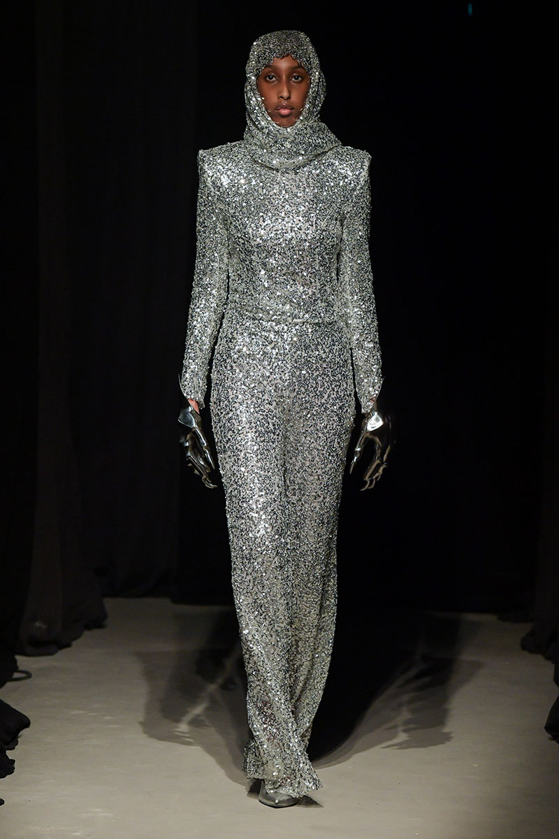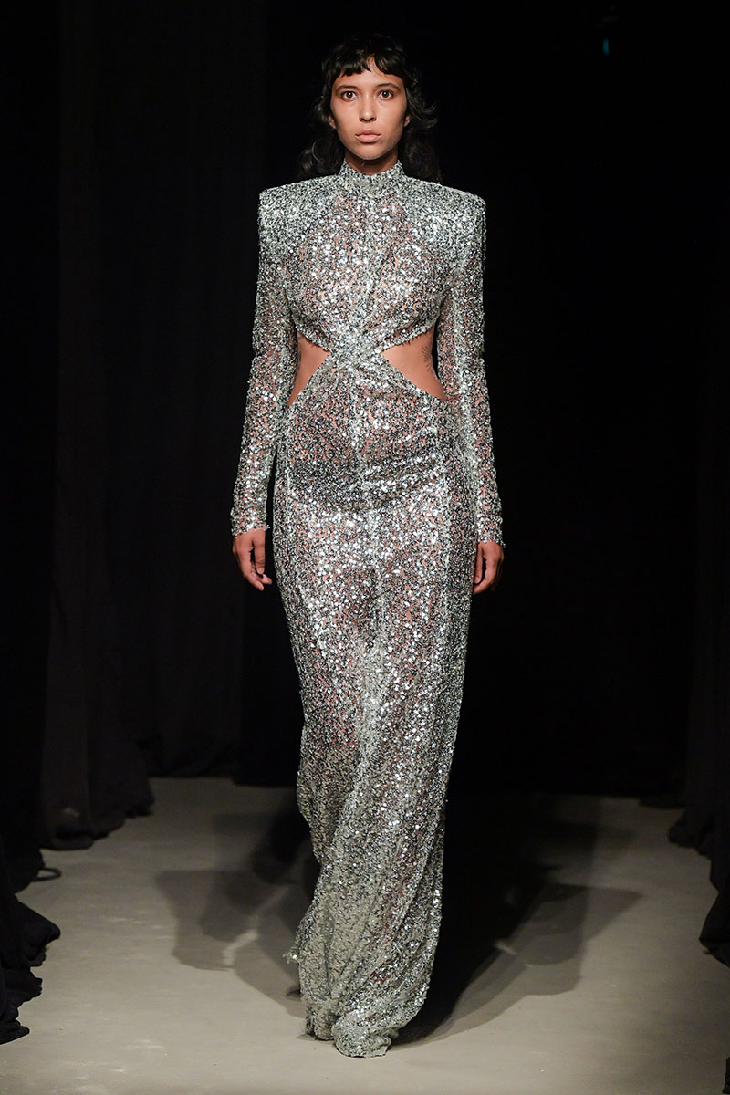 Diseños llenos de aberturas tanto en las partes superiores de los conjuntos como en las inferiores dejan ver el cuerpo de la variada e inclusiva cantera de modelos. Adornos metálicos y estructuras de tela se añaden a algunos de los diseños más “sencillos” dándole un push extra de creatividad a la silueta final. También encontramos algunos diseños confeccionados a partir de telas de transparencias y otros directamente hechos para brillar debido a su tejido plateado brillante de lentejuelas.