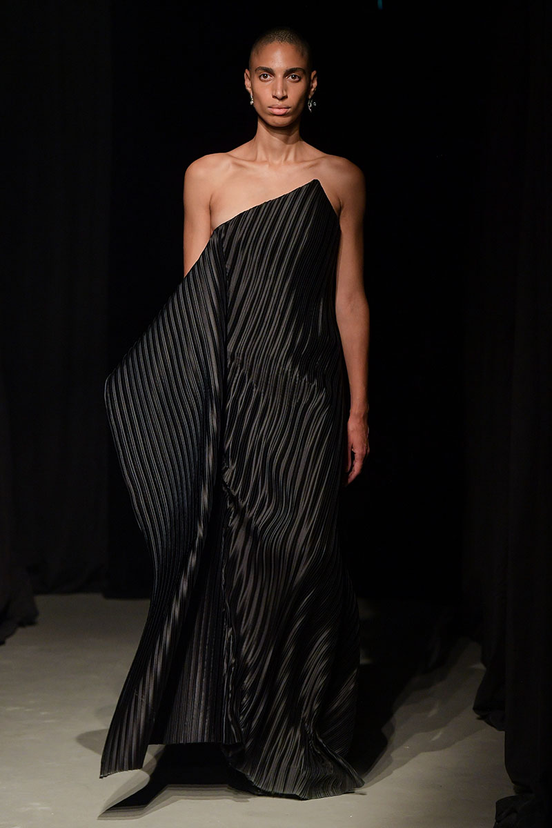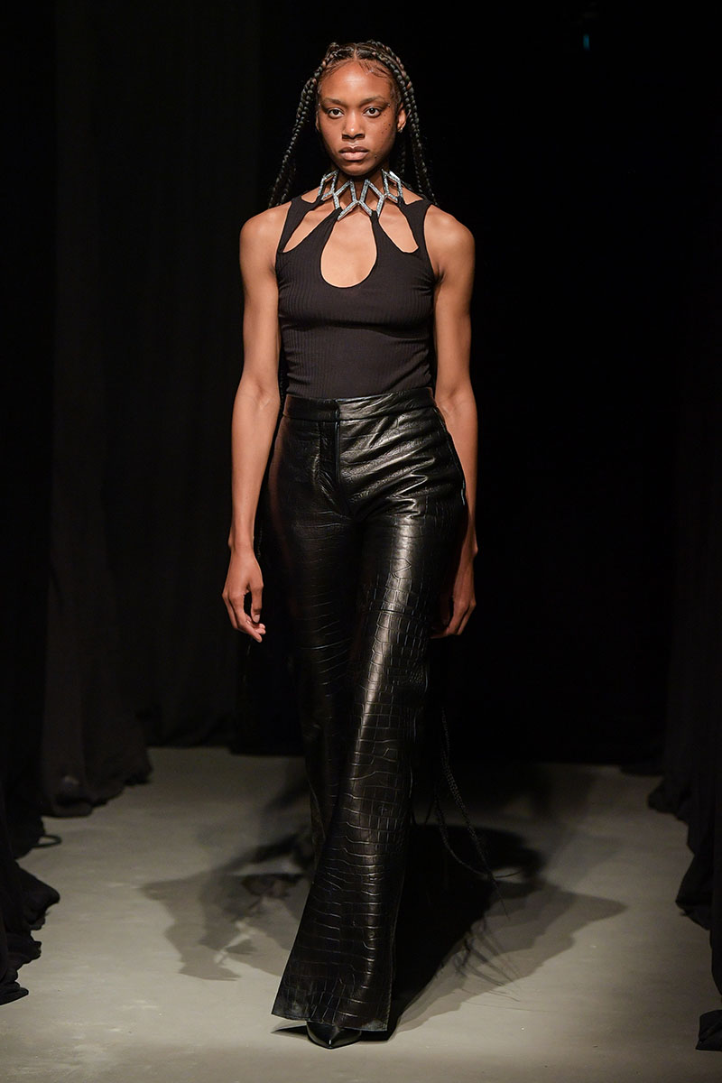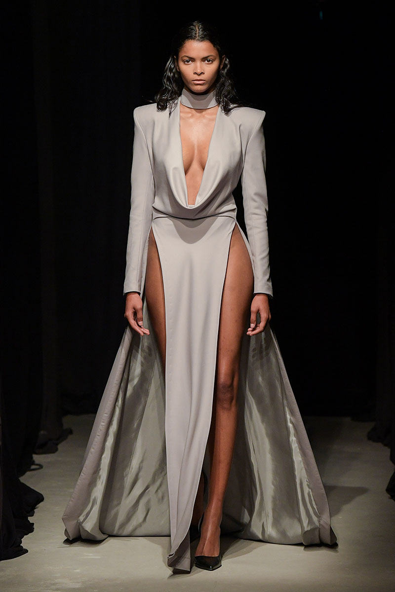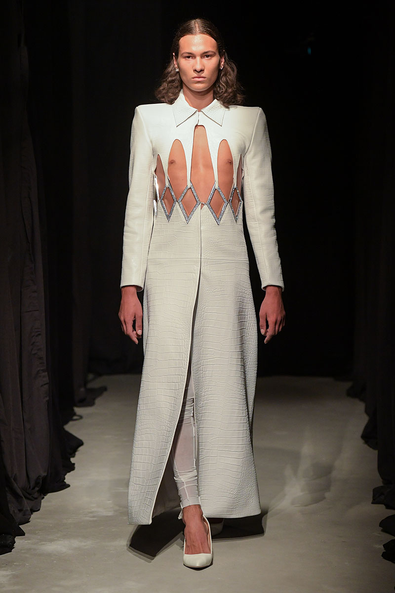 Diseños llenos de aberturas tanto en las partes superiores de los conjuntos como en las inferiores dejan ver el cuerpo de la variada e inclusiva cantera de modelos. Adornos metálicos y estructuras de tela se añaden a algunos de los diseños más “sencillos” dándole un push extra de creatividad a la silueta final. También encontramos algunos diseños confeccionados a partir de telas de transparencias y otros directamente hechos para brillar debido a su tejido plateado brillante de lentejuelas.