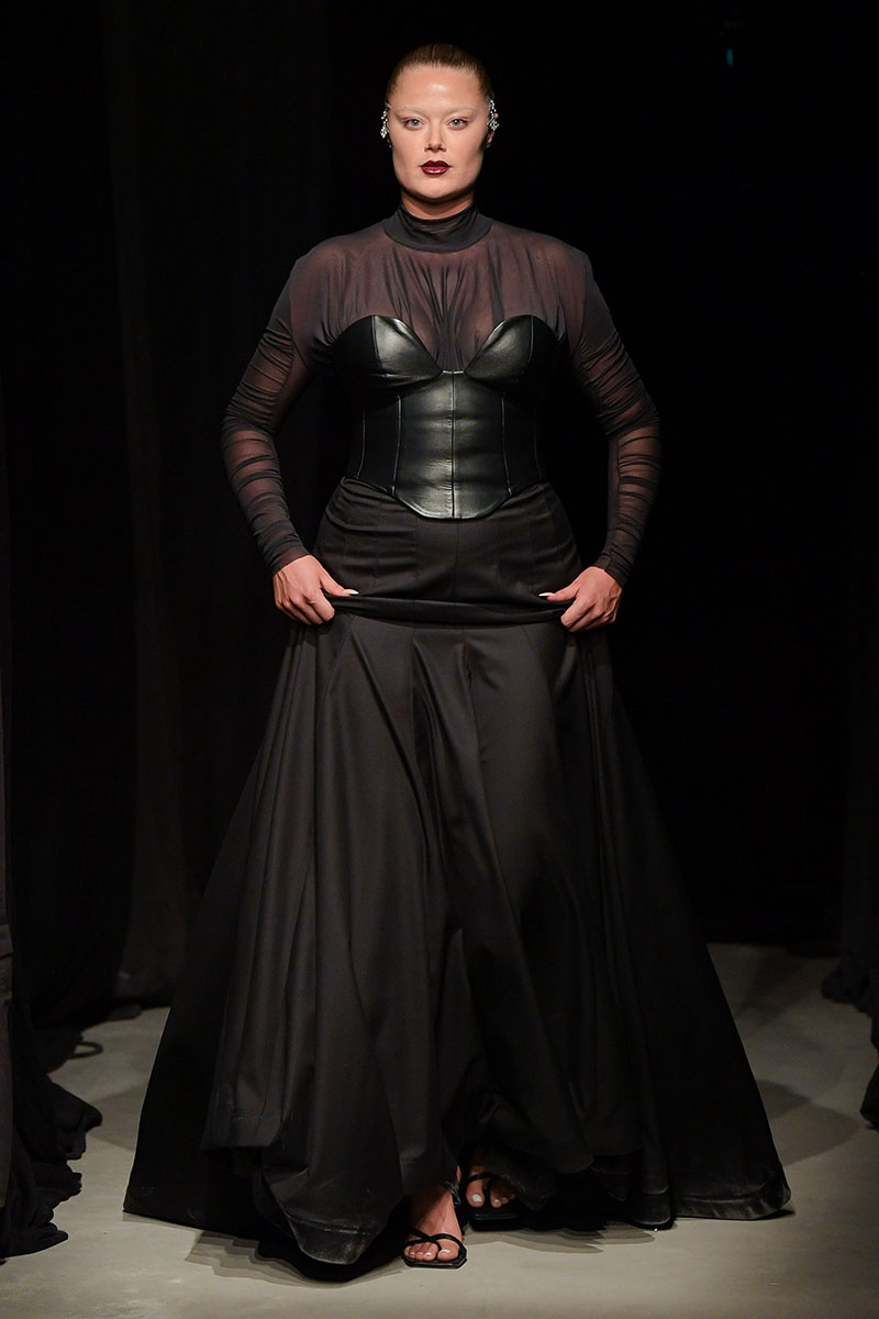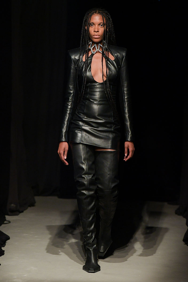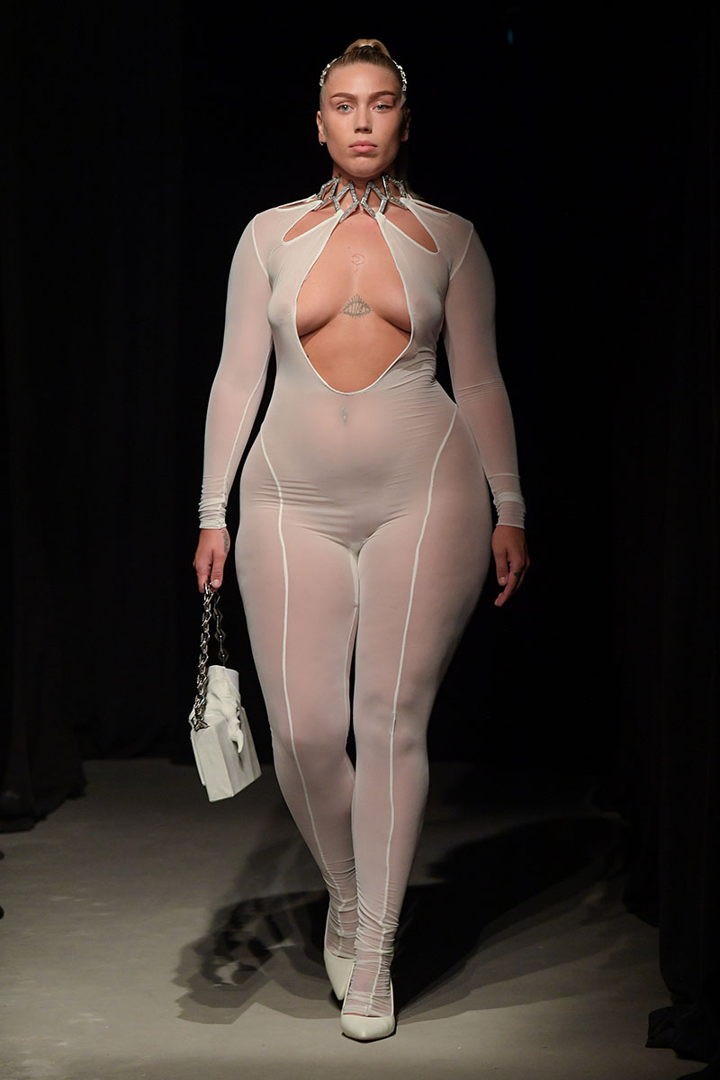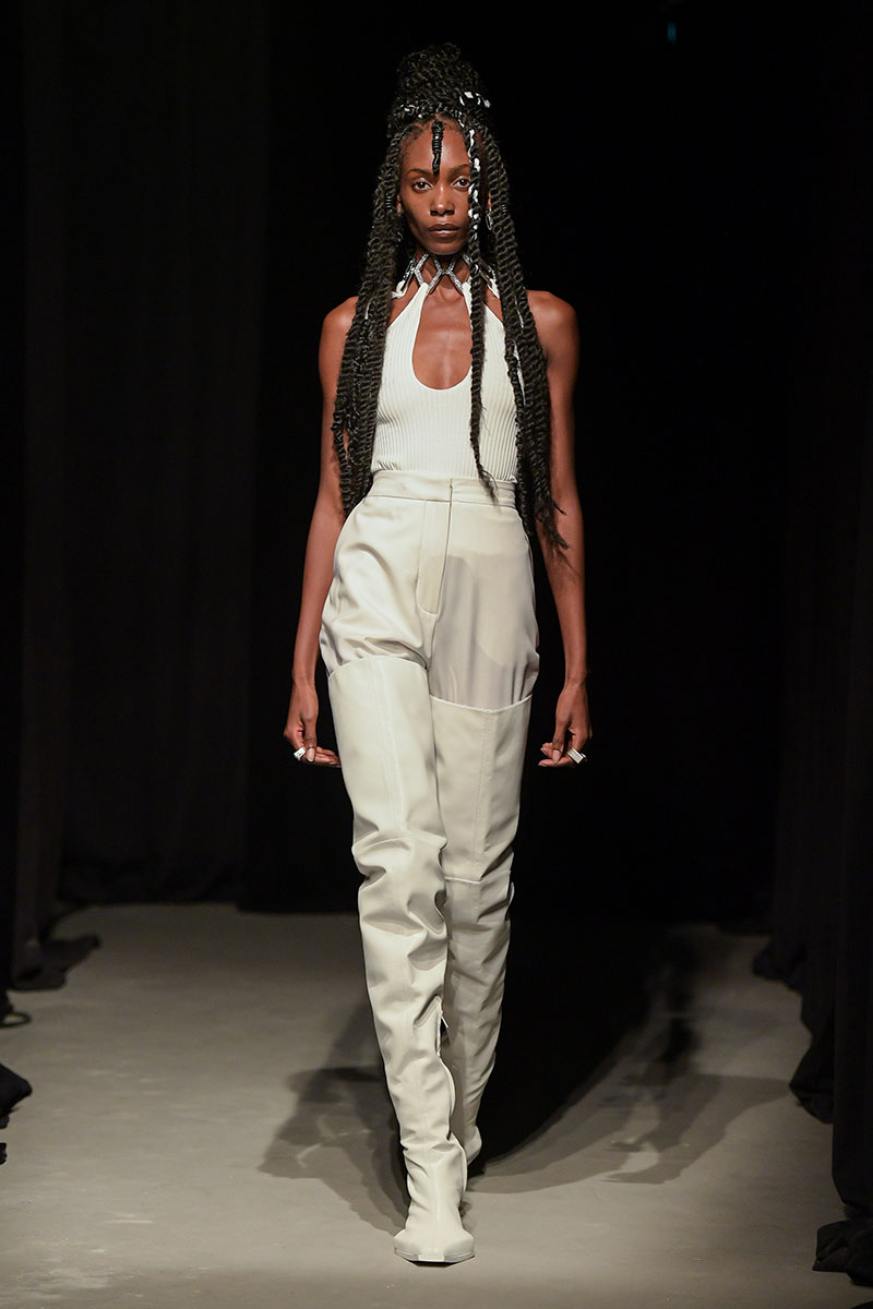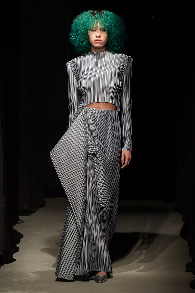 Diseños llenos de aberturas tanto en las partes superiores de los conjuntos como en las inferiores dejan ver el cuerpo de la variada e inclusiva cantera de modelos. Adornos metálicos y estructuras de tela se añaden a algunos de los diseños más “sencillos” dándole un push extra de creatividad a la silueta final. También encontramos algunos diseños confeccionados a partir de telas de transparencias y otros directamente hechos para brillar debido a su tejido plateado brillante de lentejuelas.